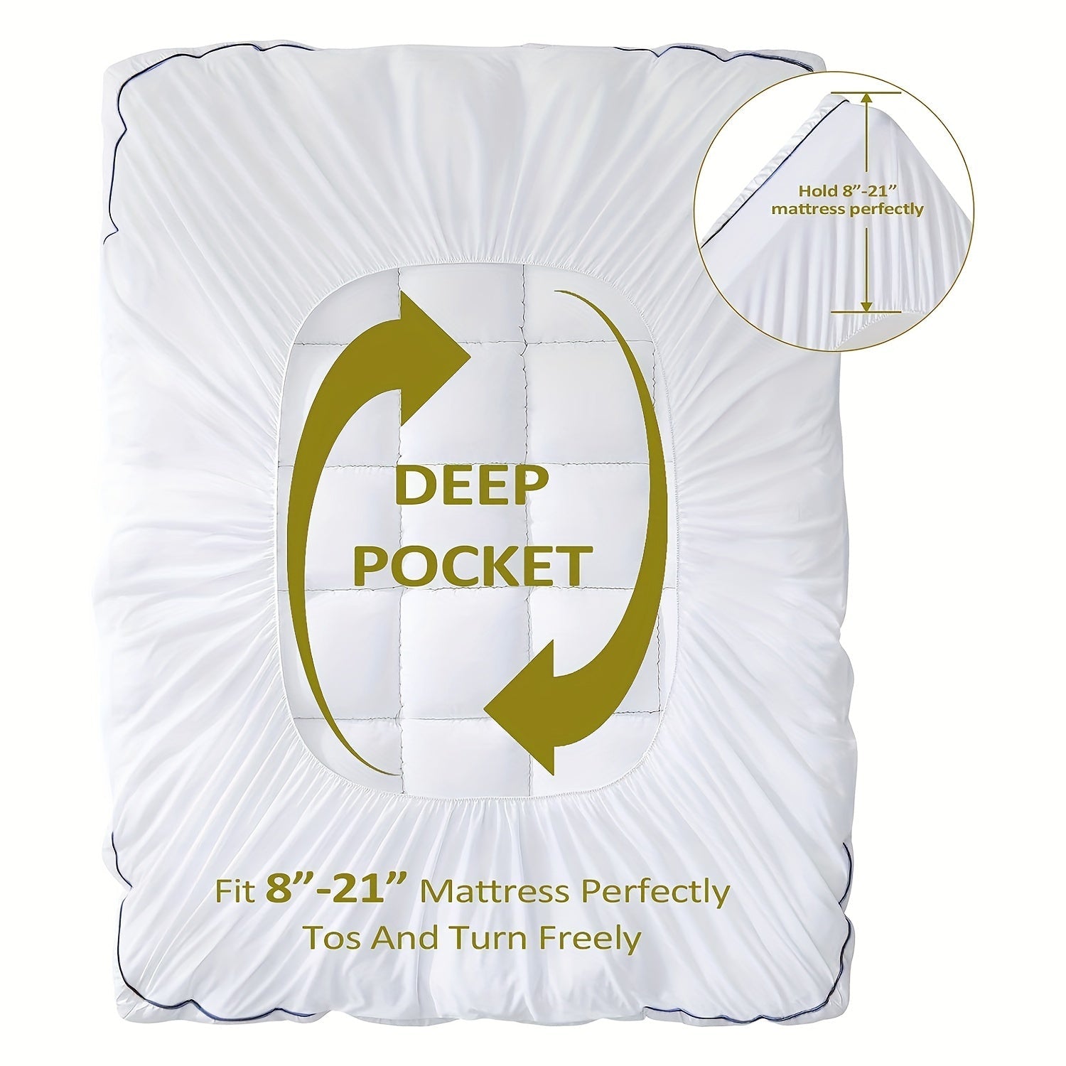 Diseño de bolsillo profundo y sin deformaciones: el bolsillo profundo de 8-21 pulgadas de estiramiento puede envolver perfectamente su topper de colchón y colocarse fácilmente en la mayoría de los toppers, puede voltearse libremente en noches tranquilas sin ruido ni preocuparse por el movimiento del colchón. La funda de colchón está hecha de materiales de alta calidad utilizando la tecnología de tejido de la camisa, que es duradera y no hay riesgo de rasgadura incluso si se limpia con frecuencia, y mucho menos deformarse.