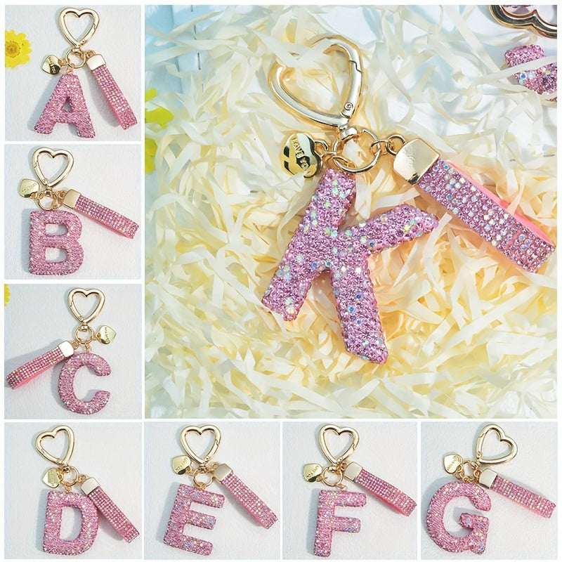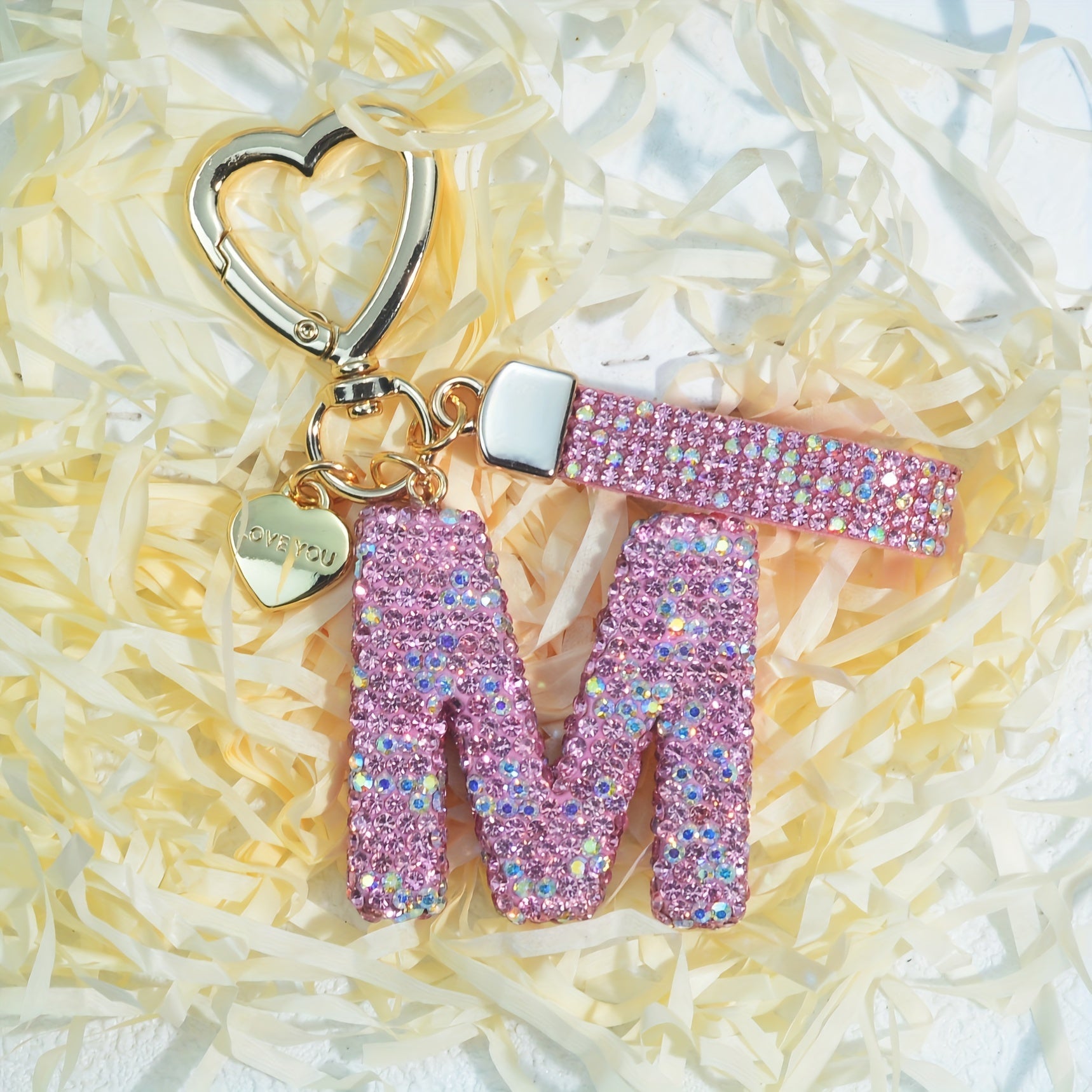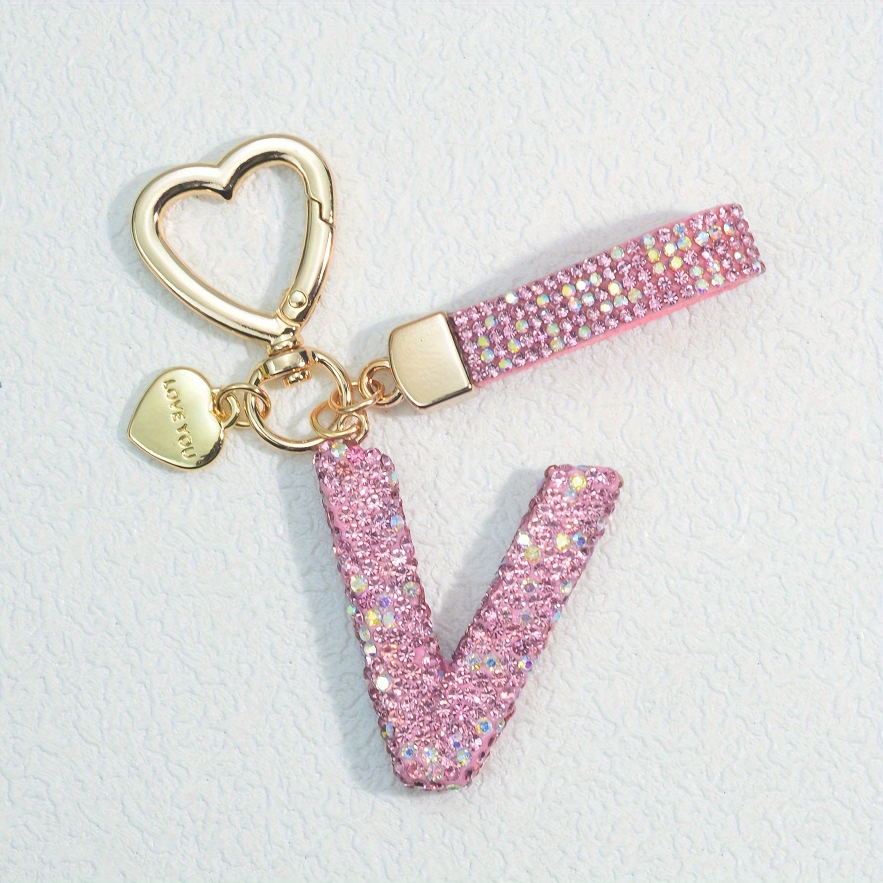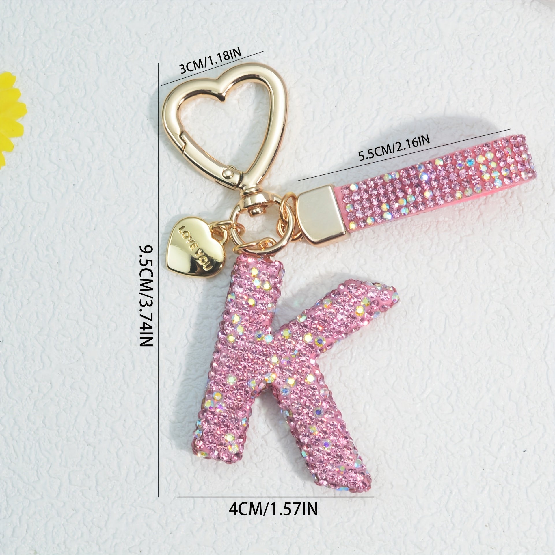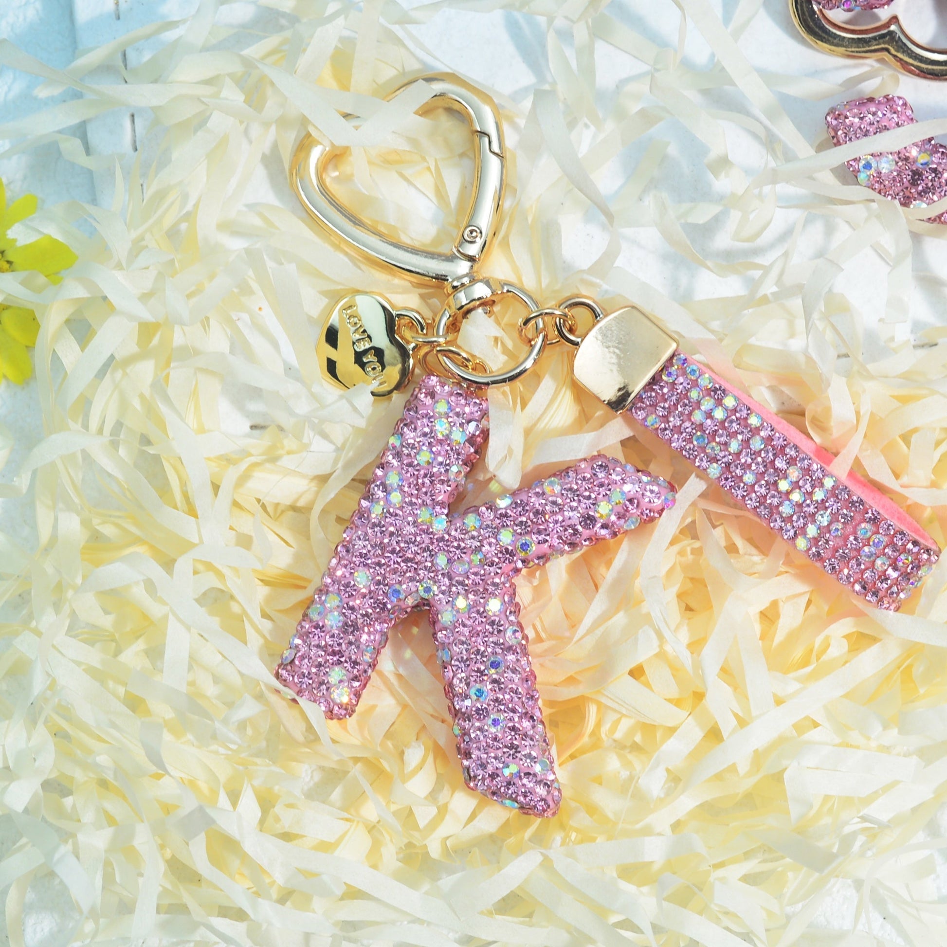 Llavero de PVC con iniciales de pedrería rosa y blanca con cierre de puño para mujeres