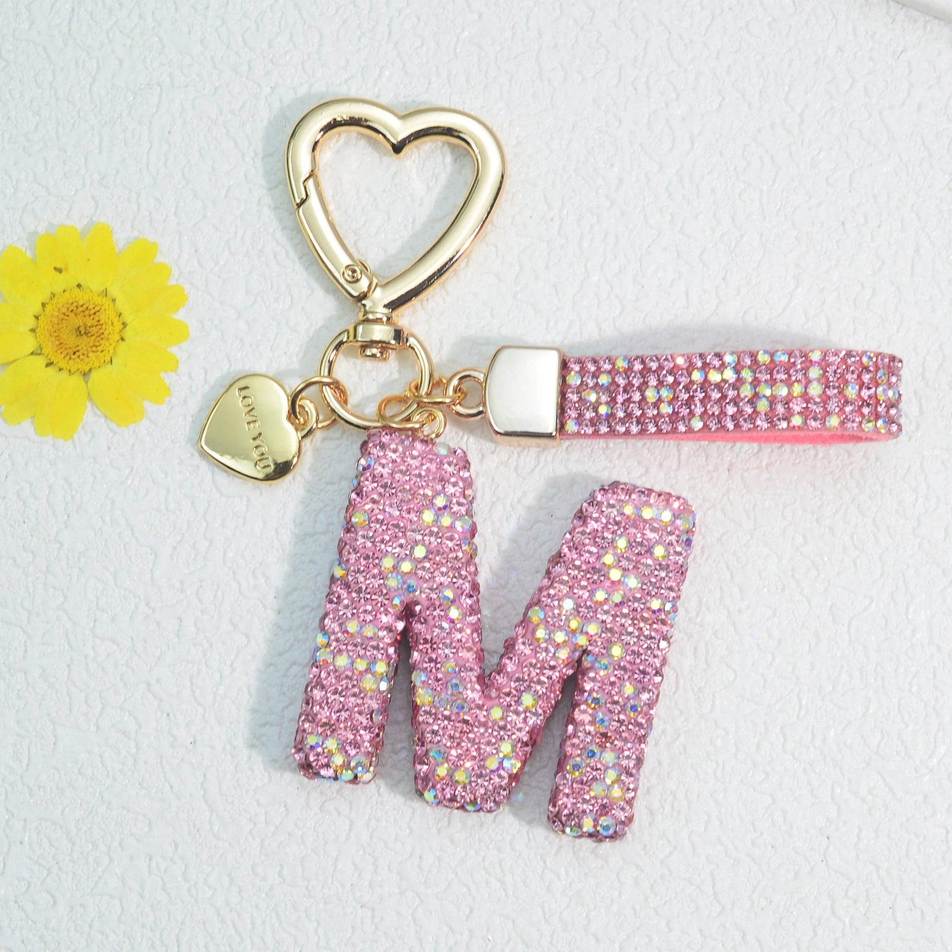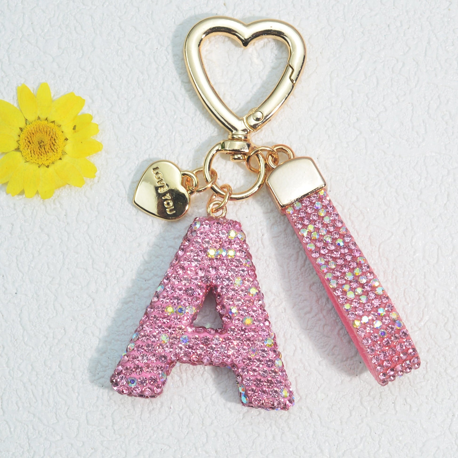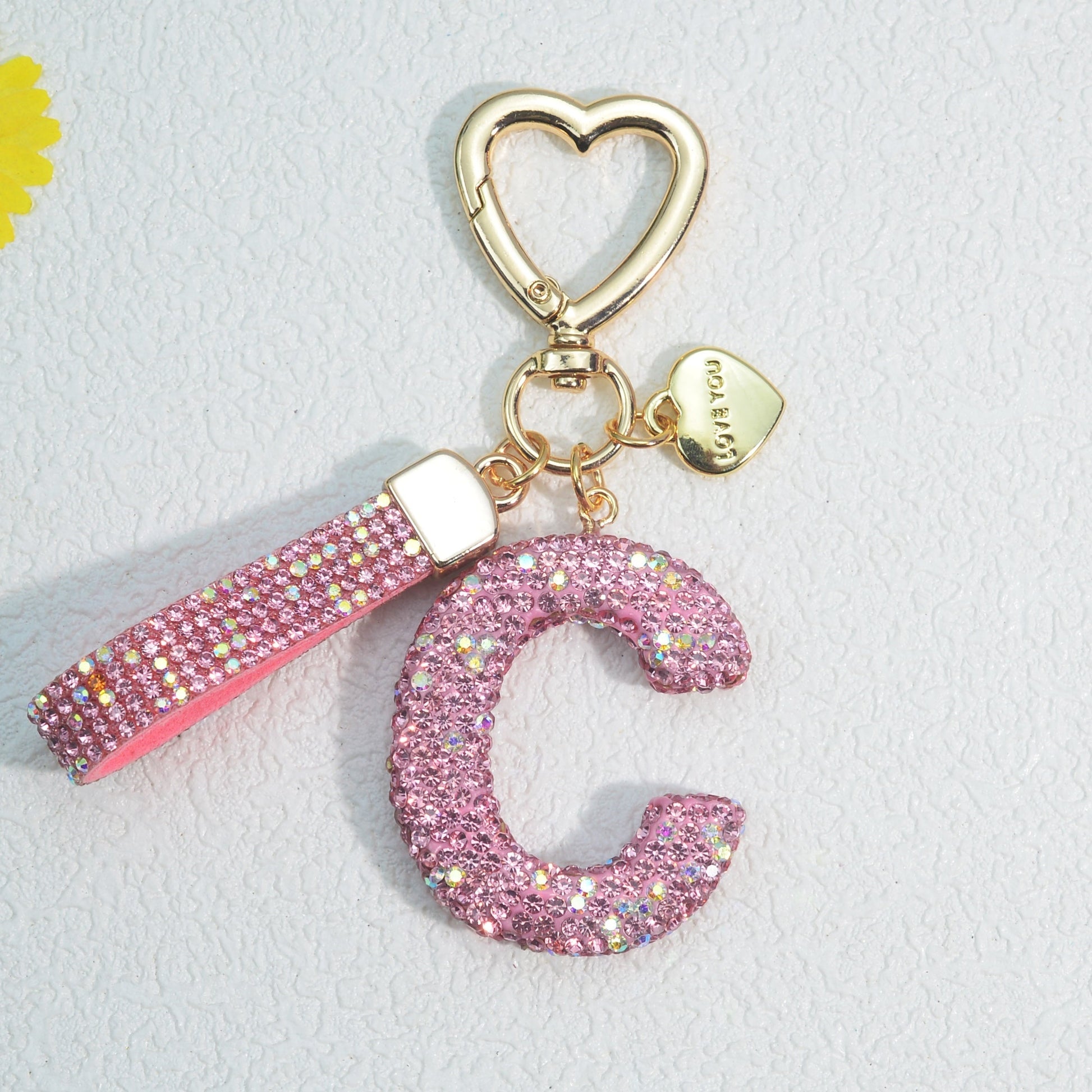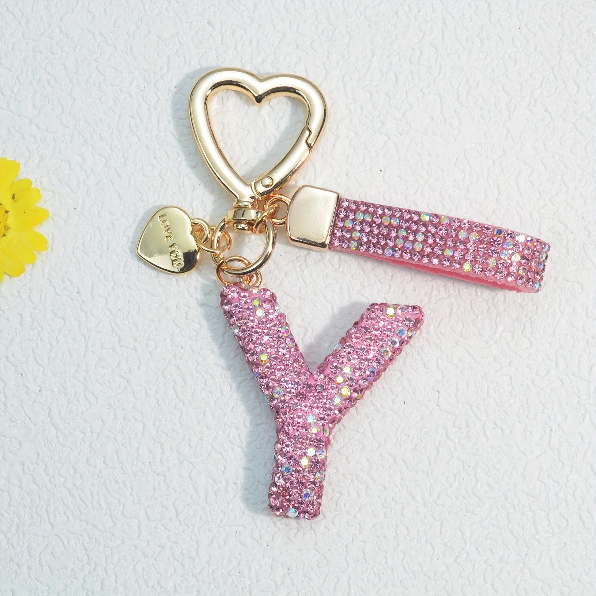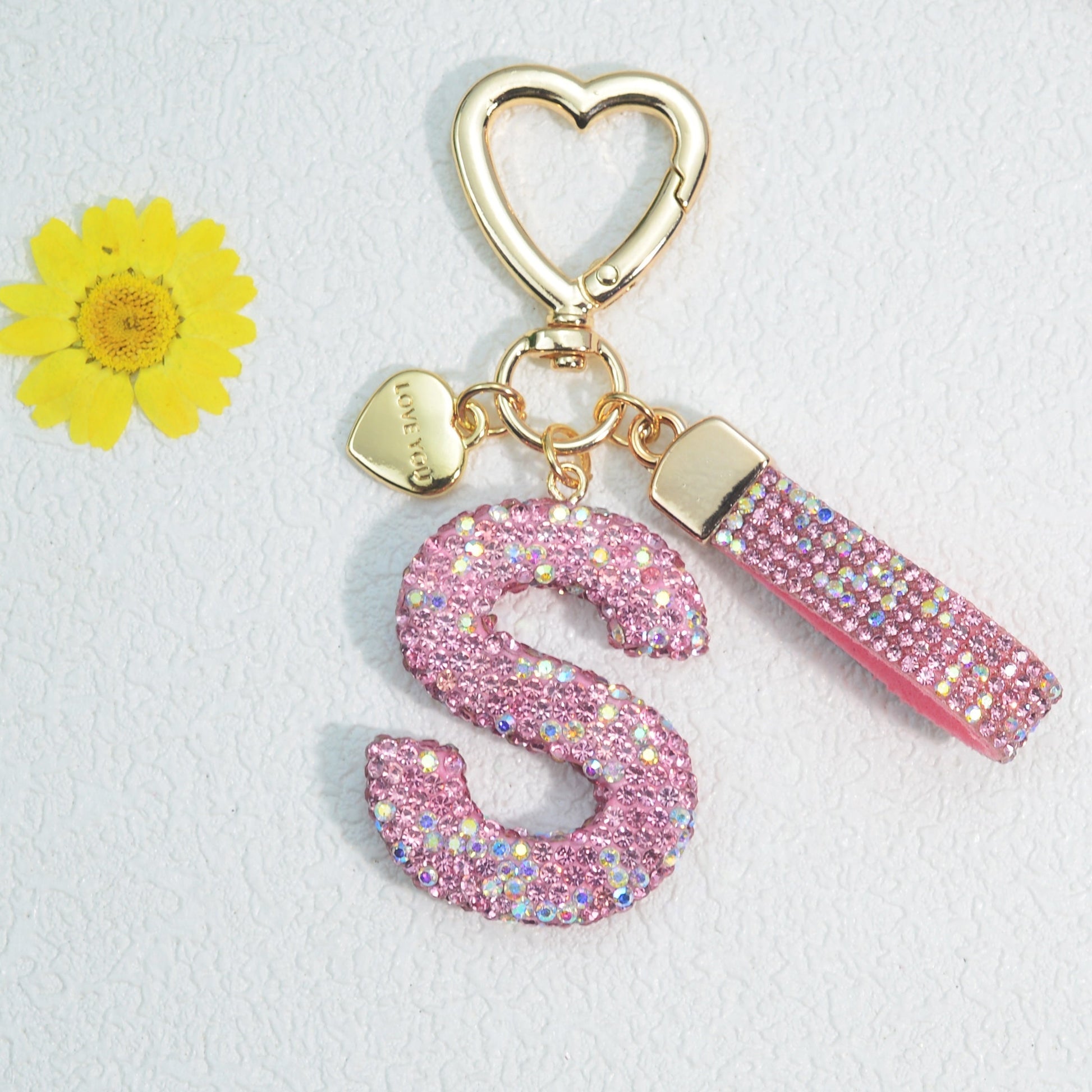 Llavero de PVC con iniciales de pedrería rosa y blanca con cierre de puño para mujeres