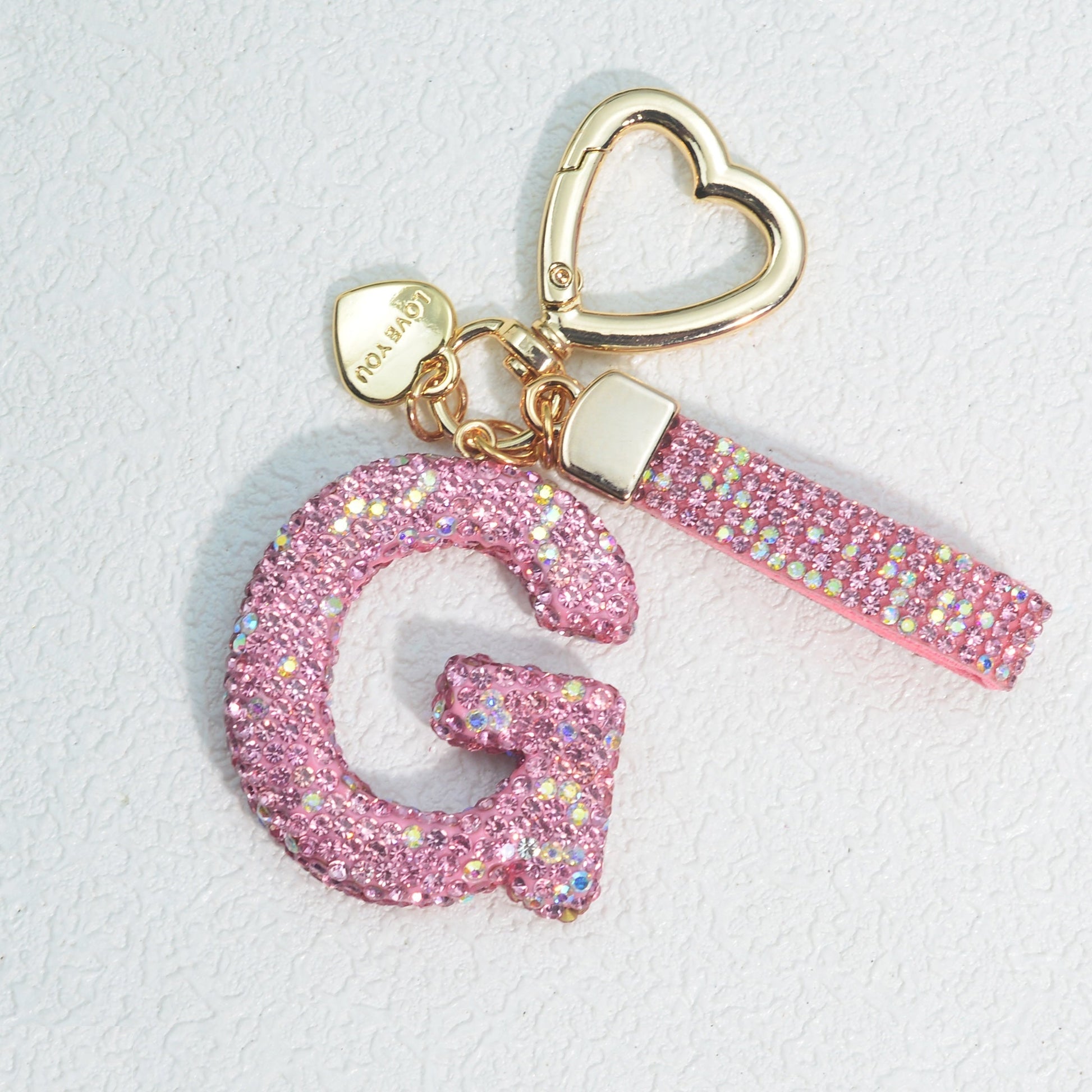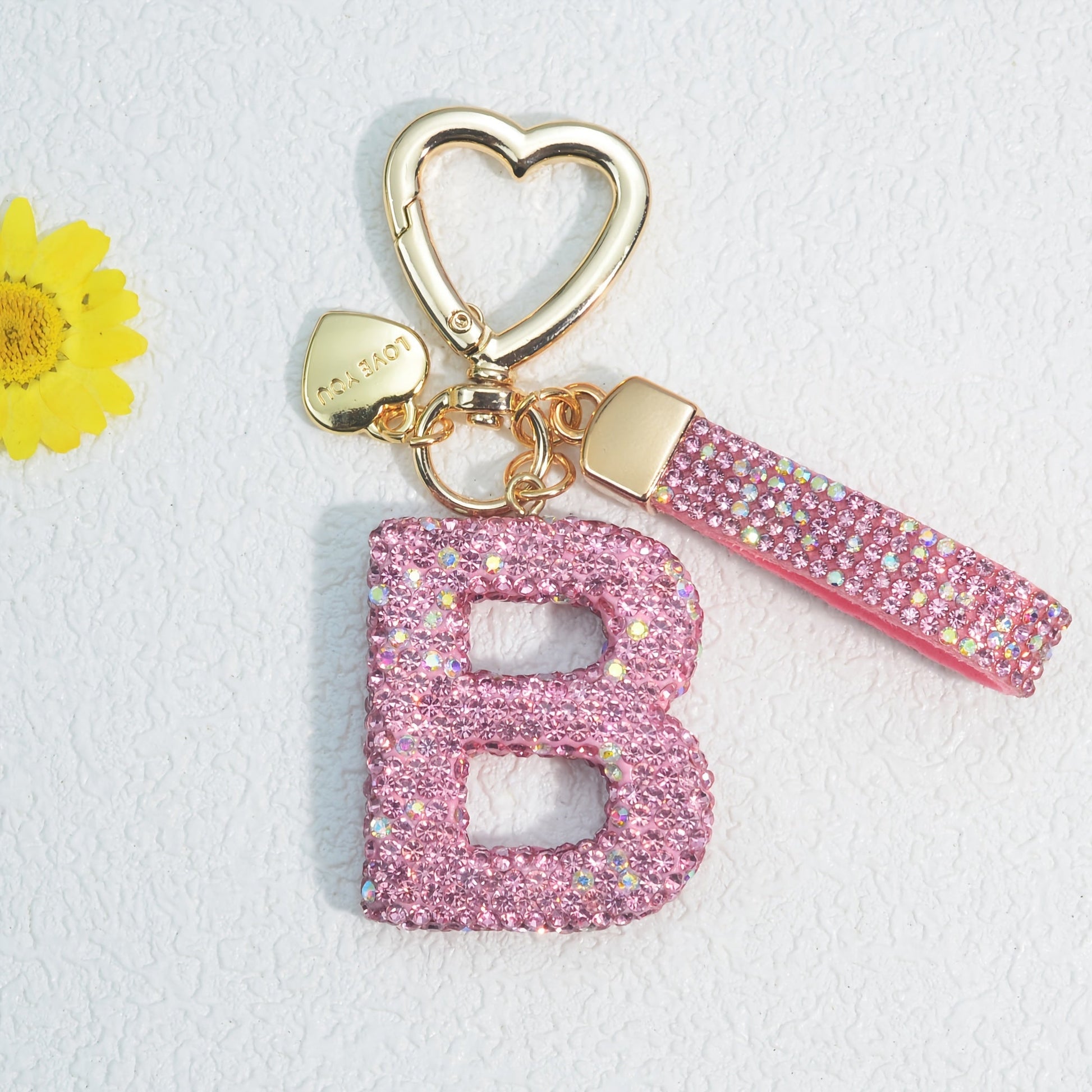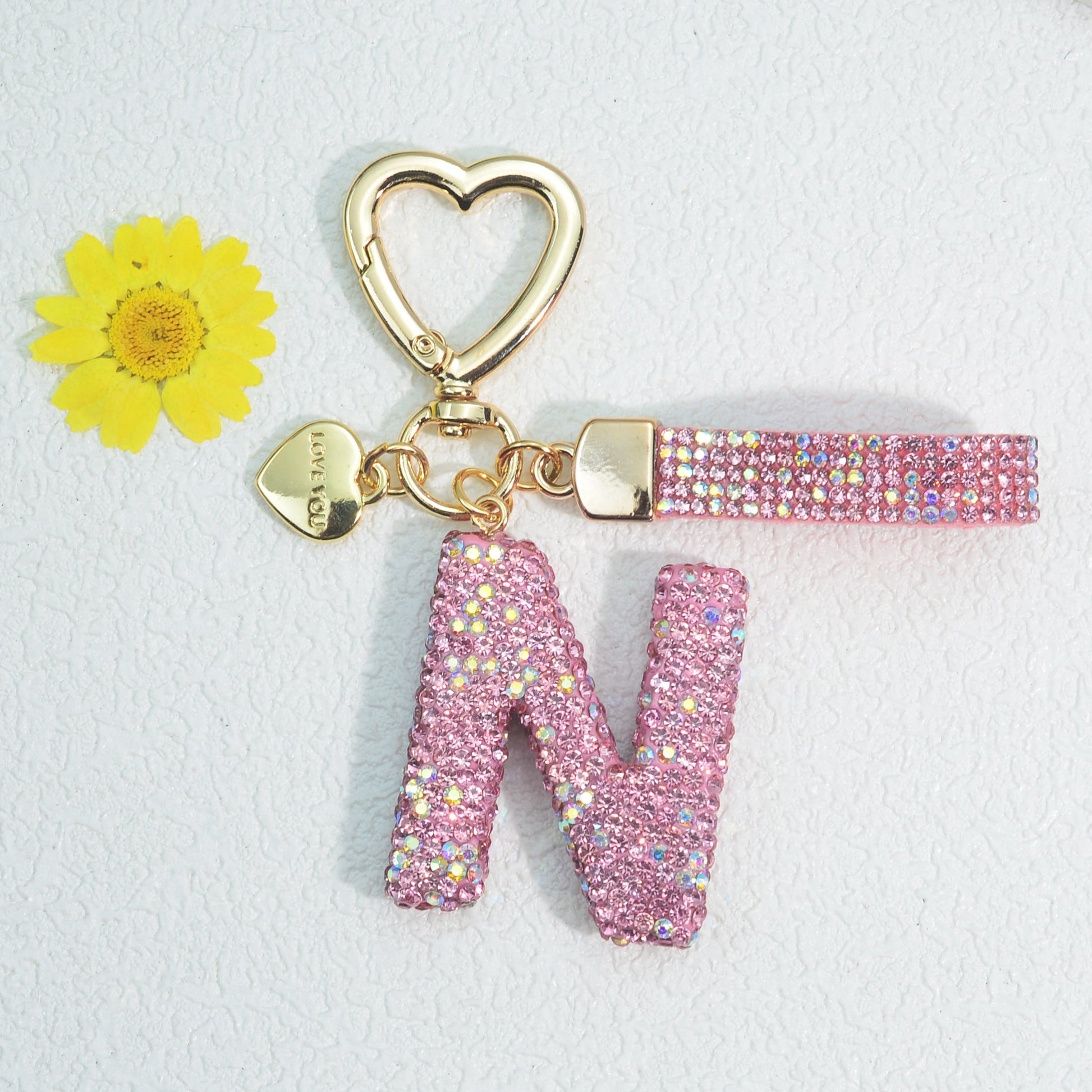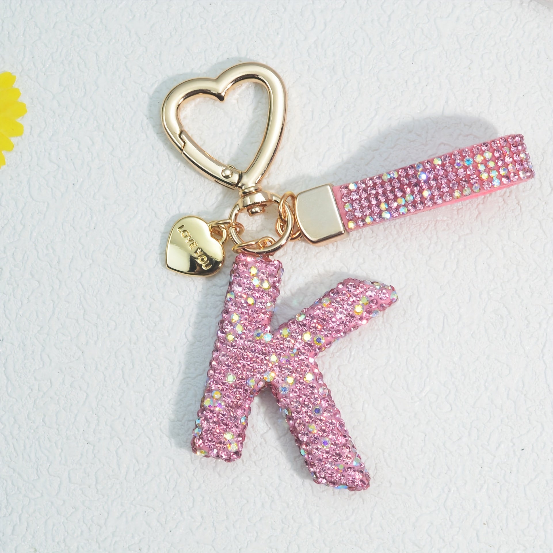 Llavero de PVC con iniciales de pedrería rosa y blanca con cierre de puño para mujeres