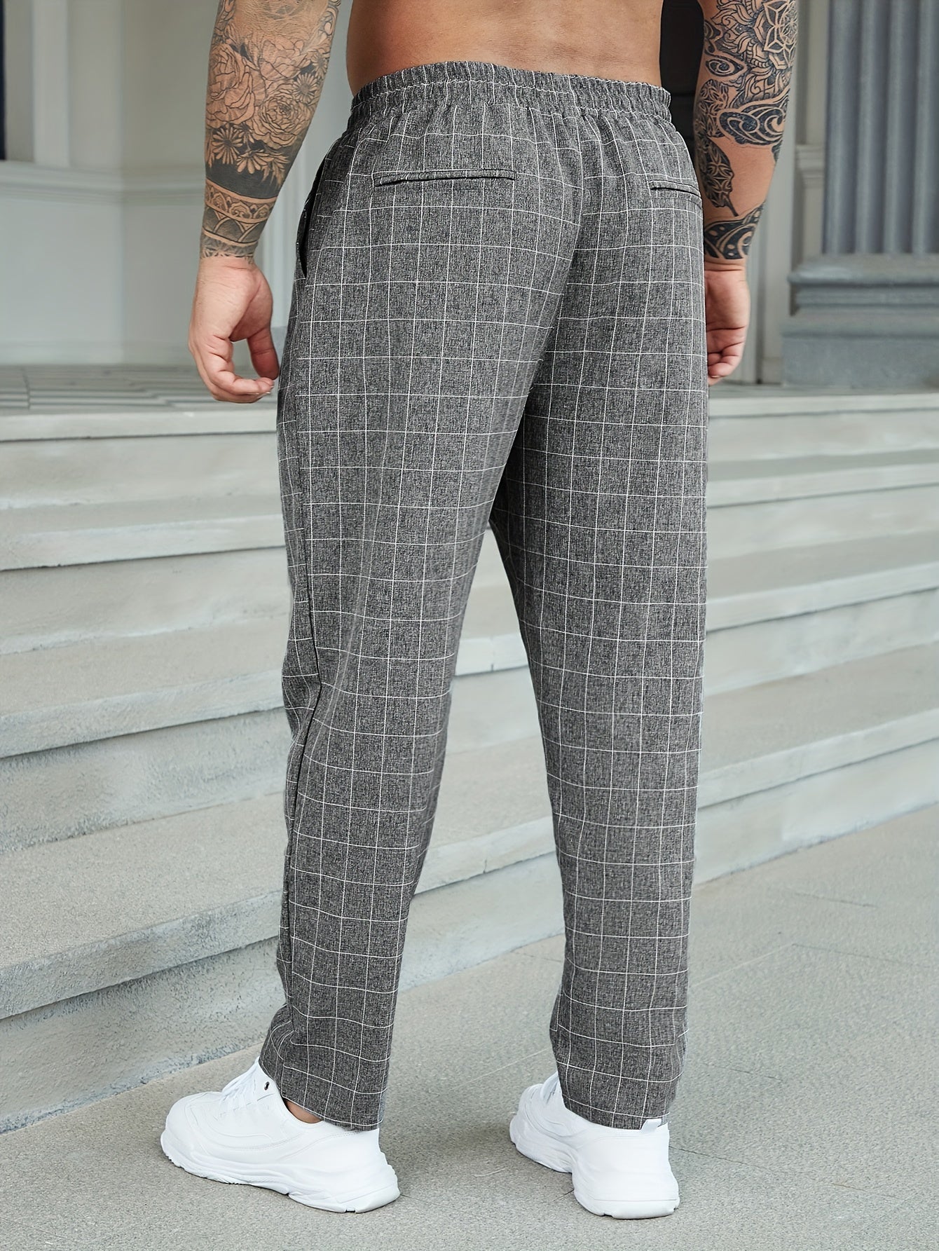Pantalones de talla grande para hombre con corte tapered y patrón de cuadrícula, casual, ajuste regular