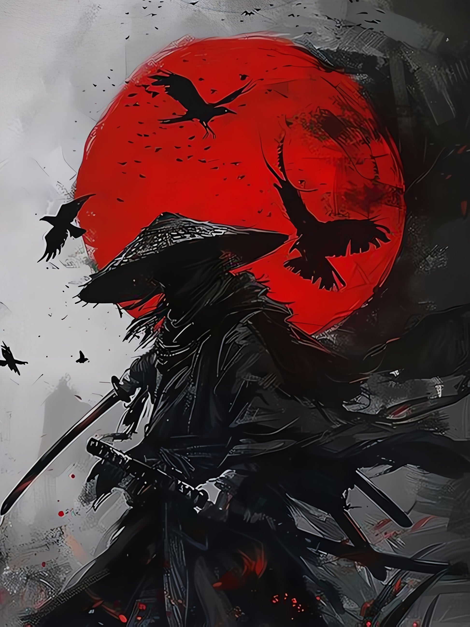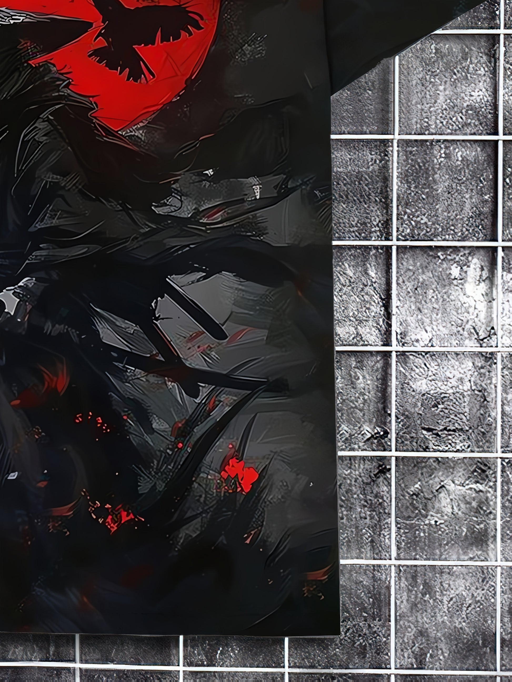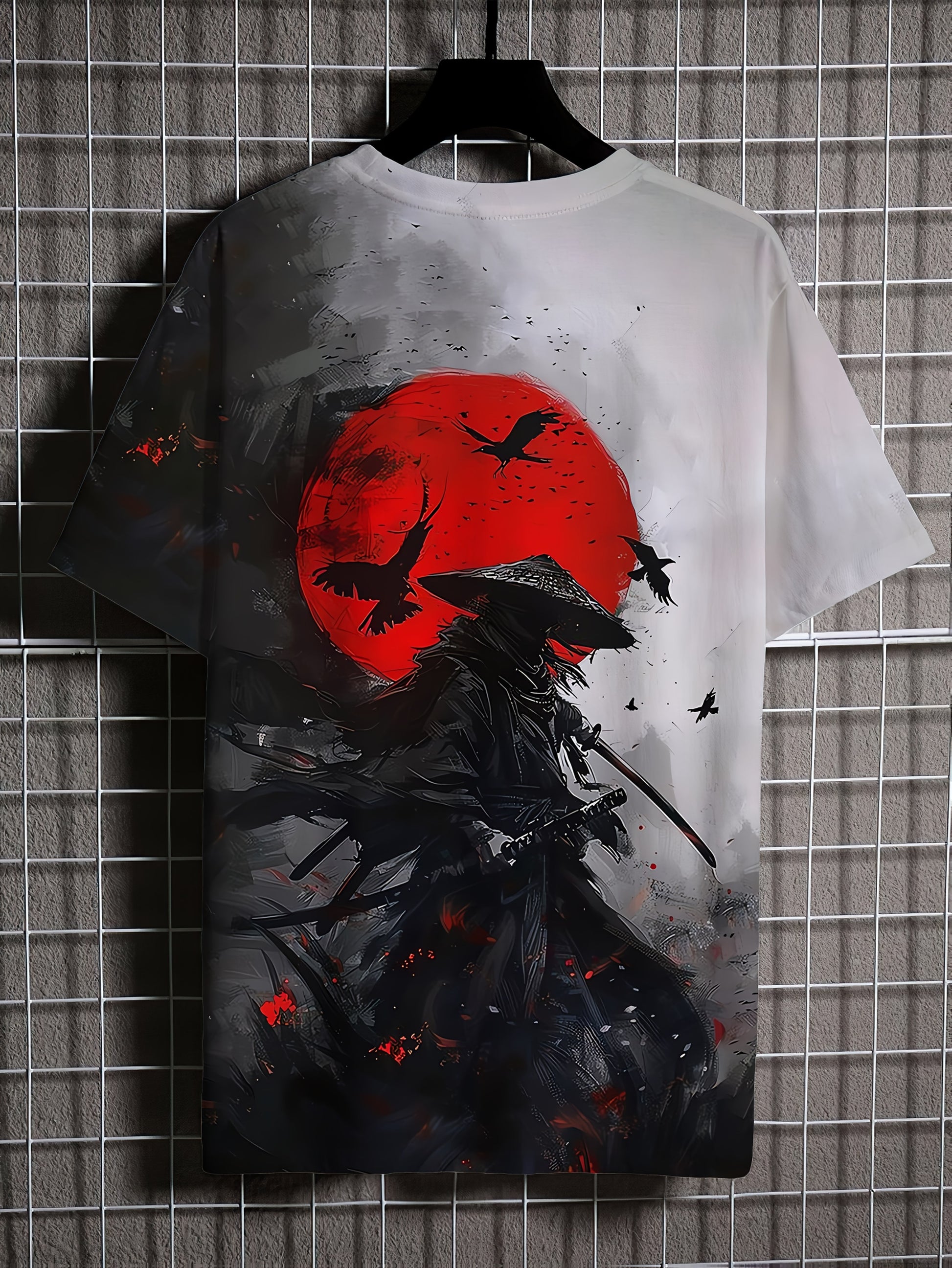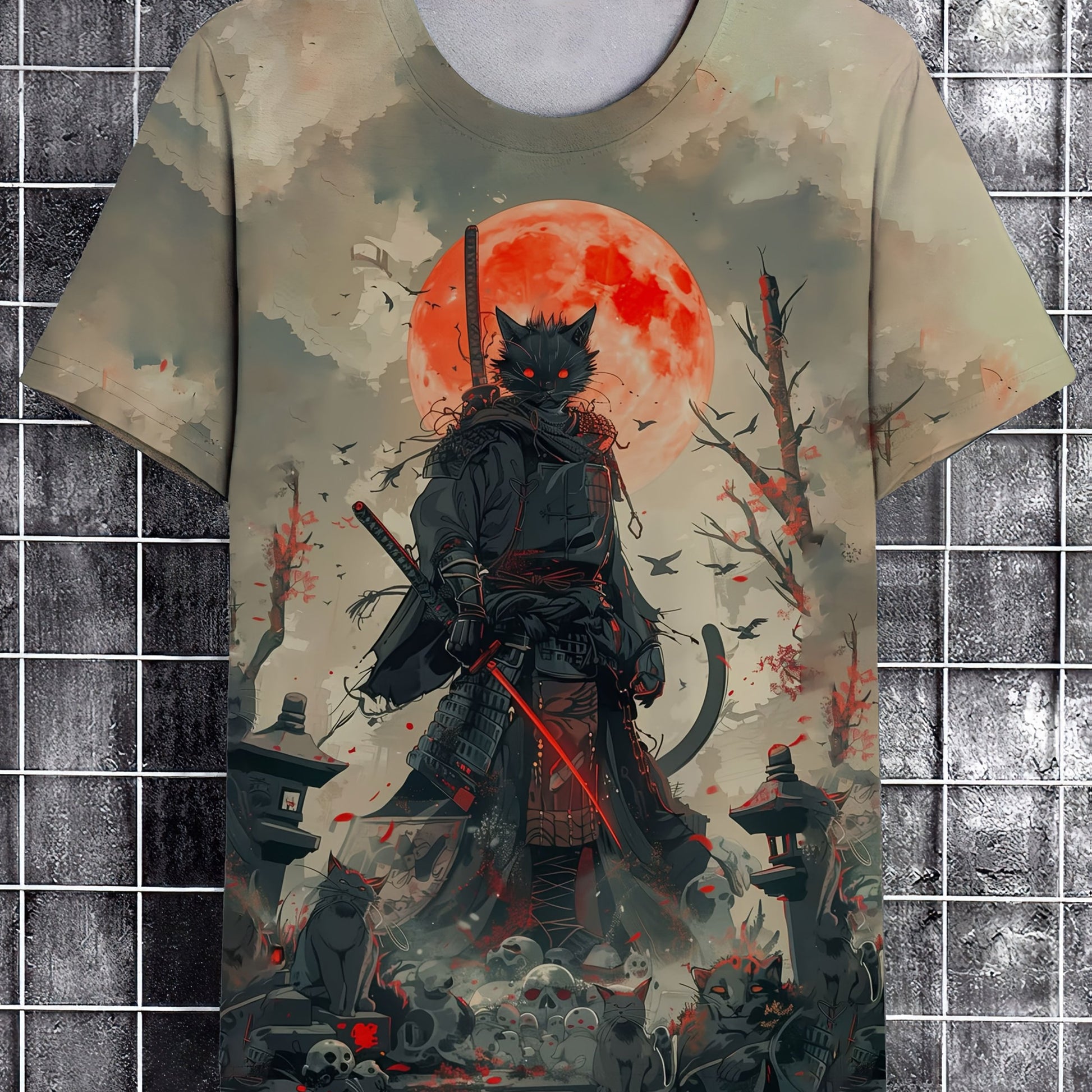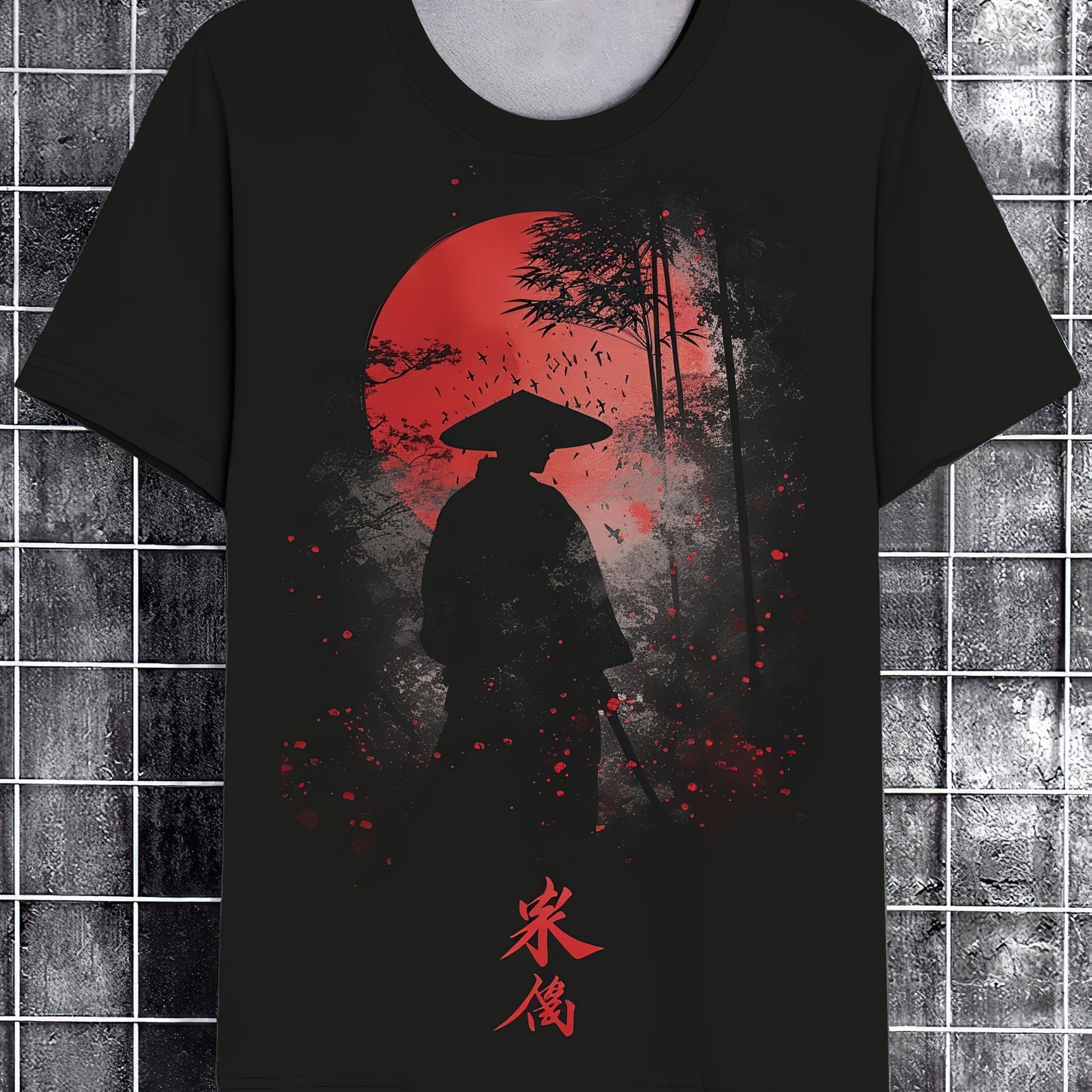 Camiseta de verano para hombre con patrón de pintura de tinta samurái de manga corta, casual, de punto, poliéster