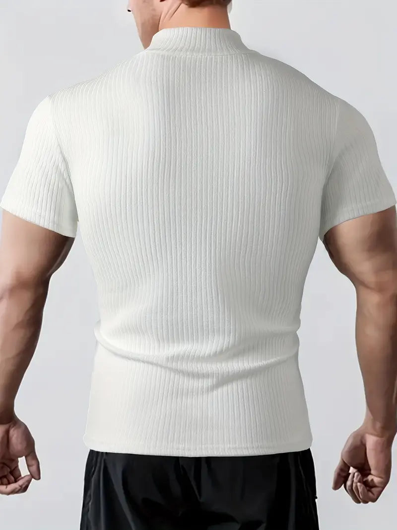 Camiseta de cuello alto con rayas negras ajustada para hombre, mezcla de poliéster, manga corta, casual y de negocios