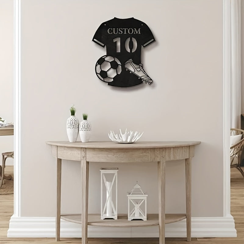 Arte de pared de metal con diseño personalizado de camiseta de fútbol, nombre y número personalizables, decorativo reutilizable y desmontable para entusiastas del deporte