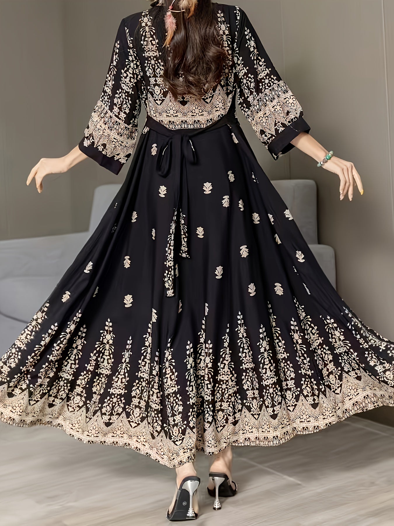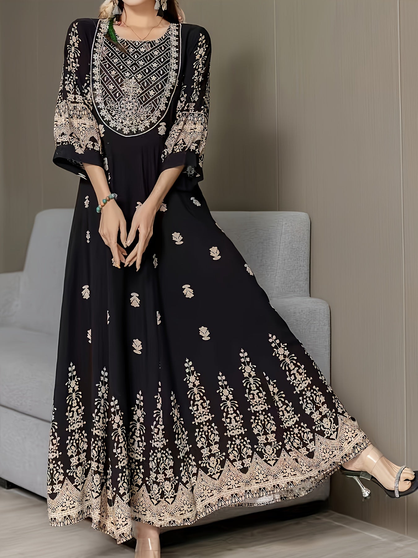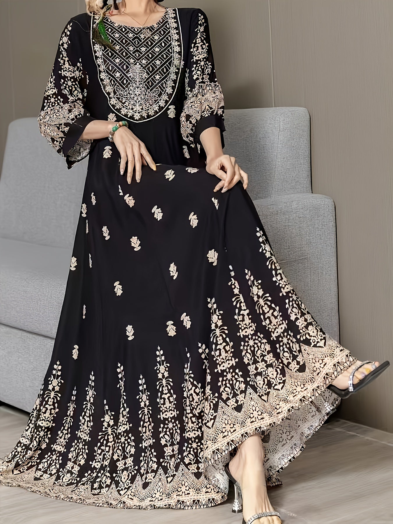 Vestido de poliéster tejido con bordado de Oriente Medio en talla grande con cinturón
