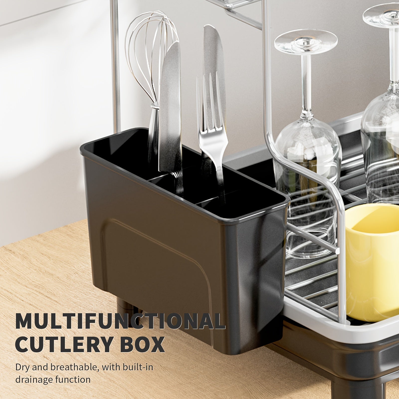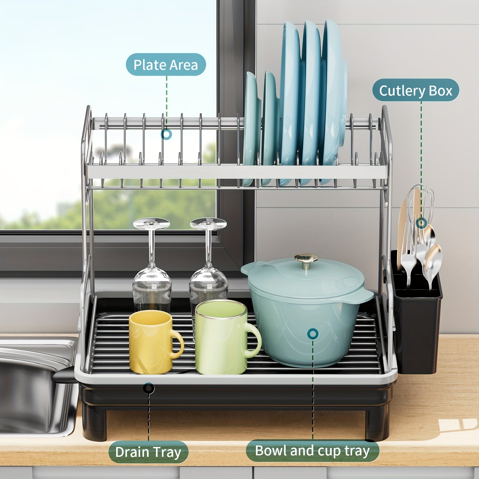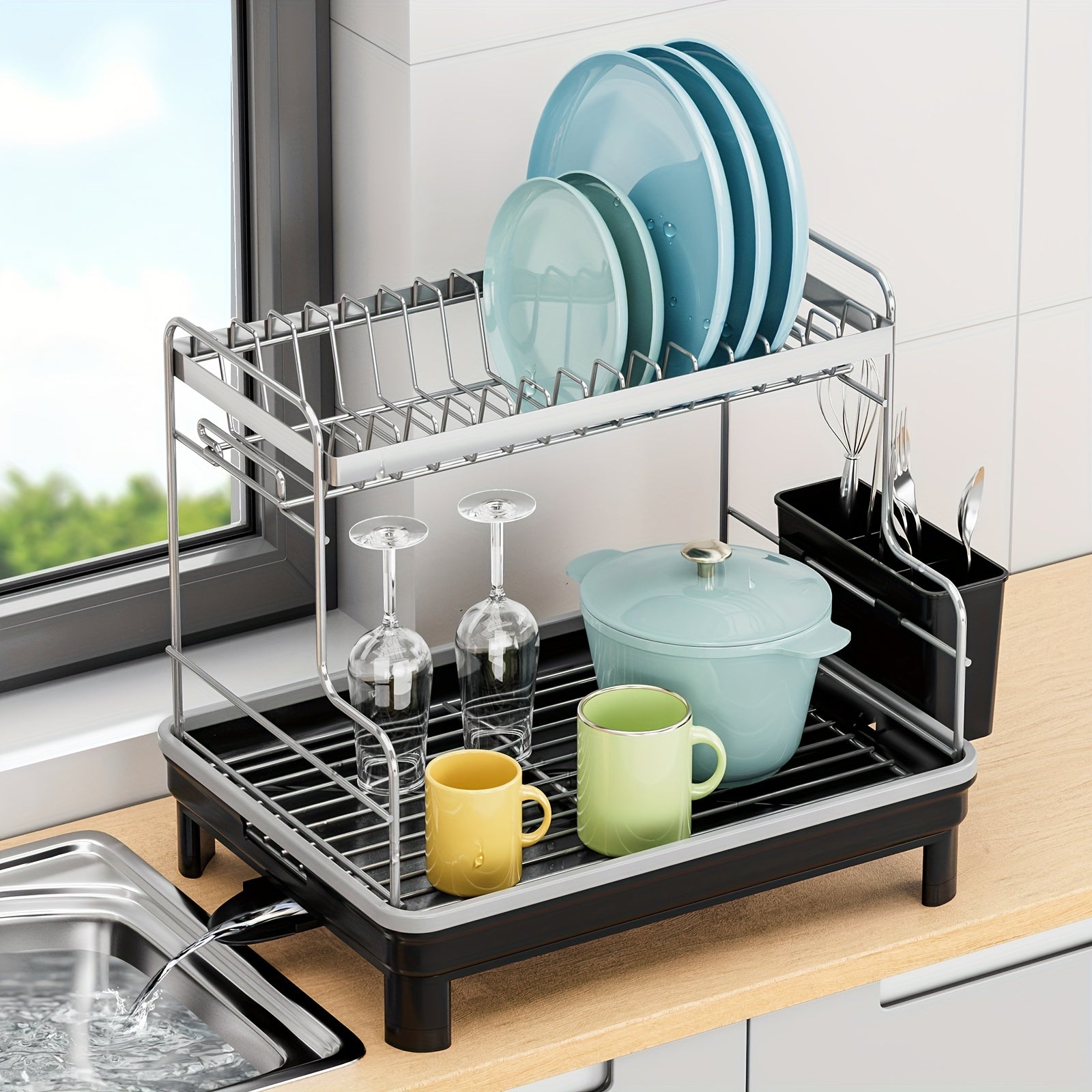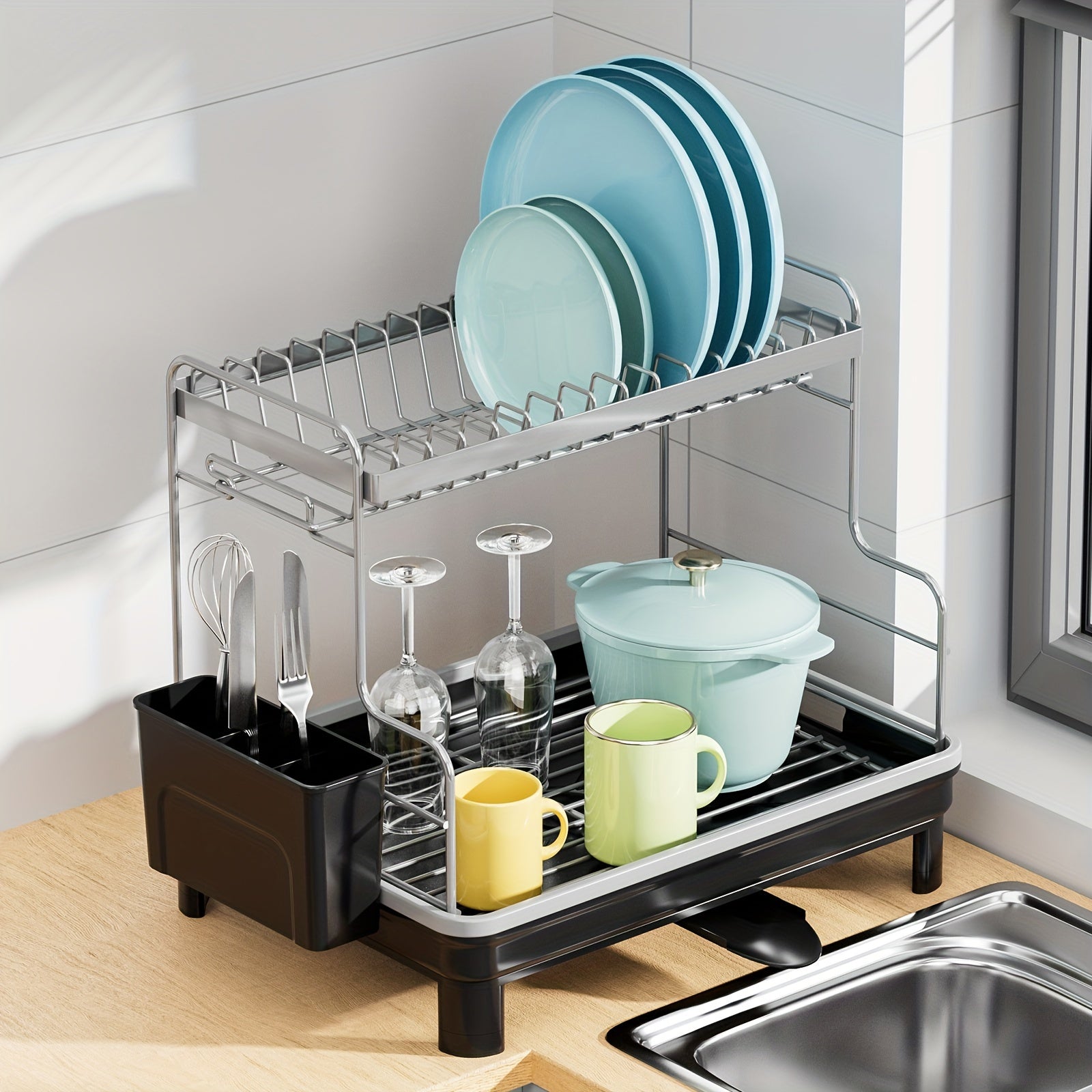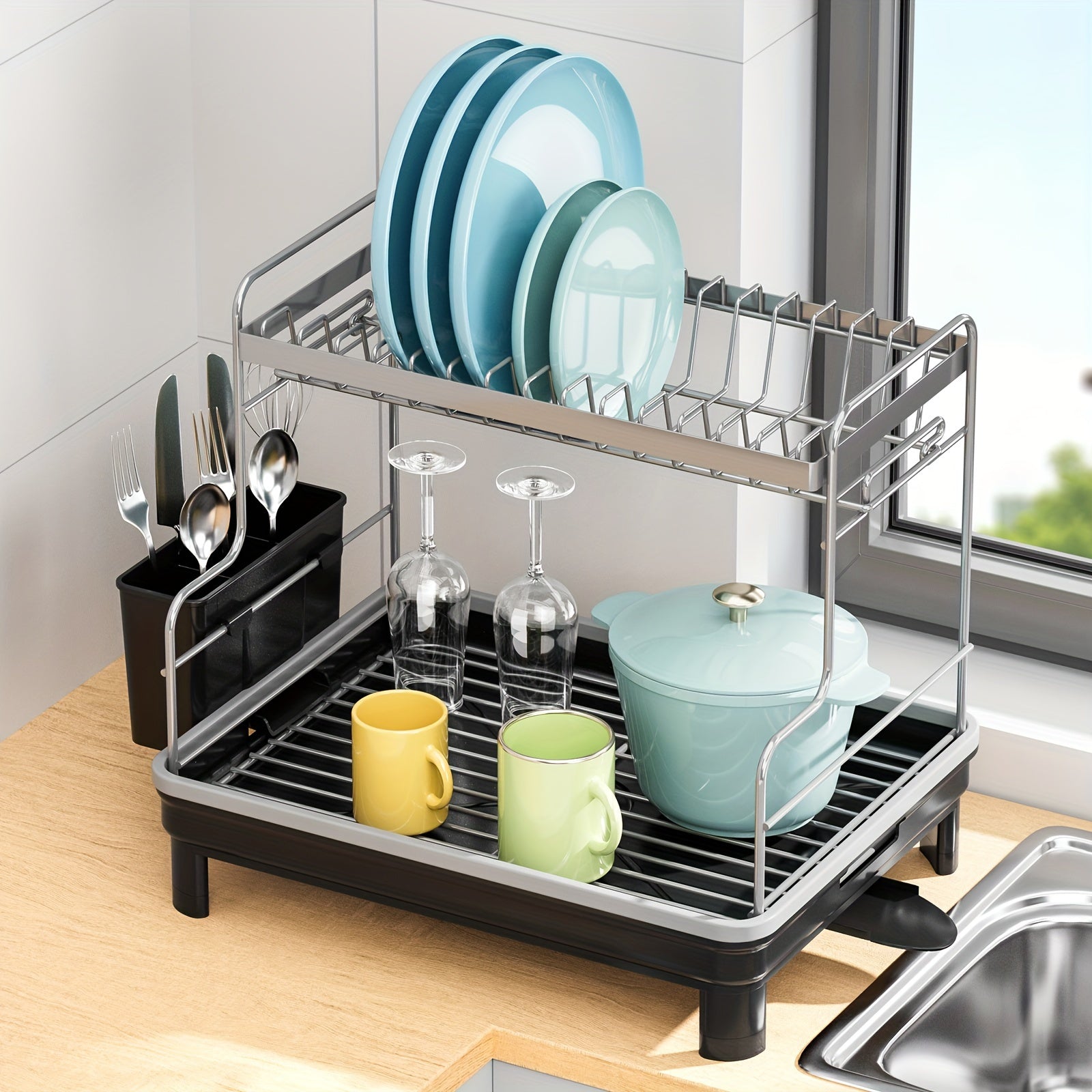 Estante de secado de platos de metal y plástico de 2 niveles con bandeja de drenaje y caddy para fregadero