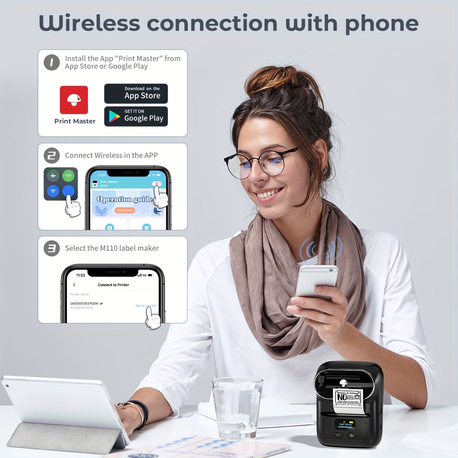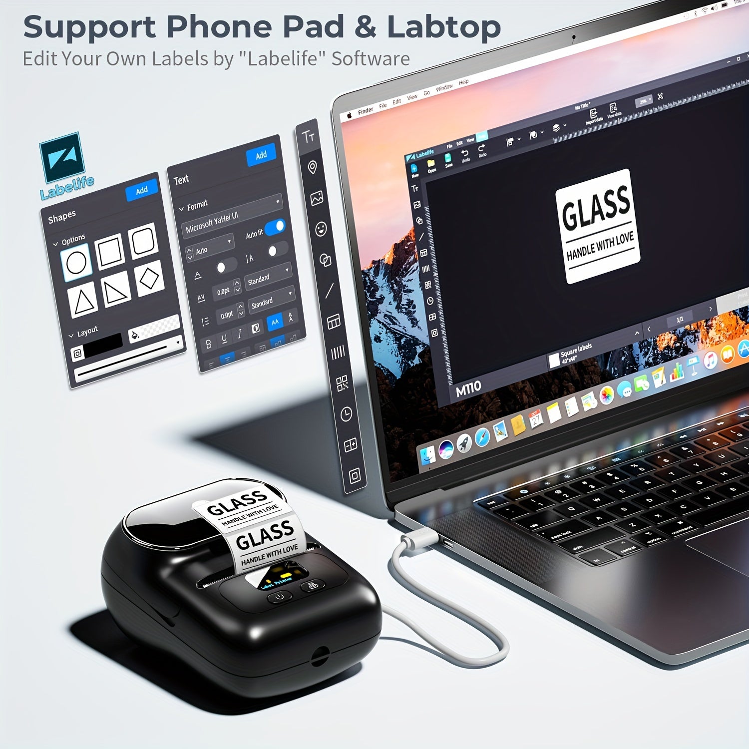 Fácil de usar, impresora de etiquetas portátil inalámbrica térmica - conecta fácilmente tu teléfono móvil. Hay muchas plantillas en la APP, puedes imprimir fácilmente cualquier etiqueta que necesites, etiquetas de ropa, etiquetas de precio, etiquetas de cables, etiquetas de joyería, etiquetas de dirección, etiquetas de carpetas, etc. El rango de ancho de etiqueta de Phomemo-M110 es de 20mm a 50mm, el ancho de impresión máximo es de 48mm. No apto para etiquetas de envío.