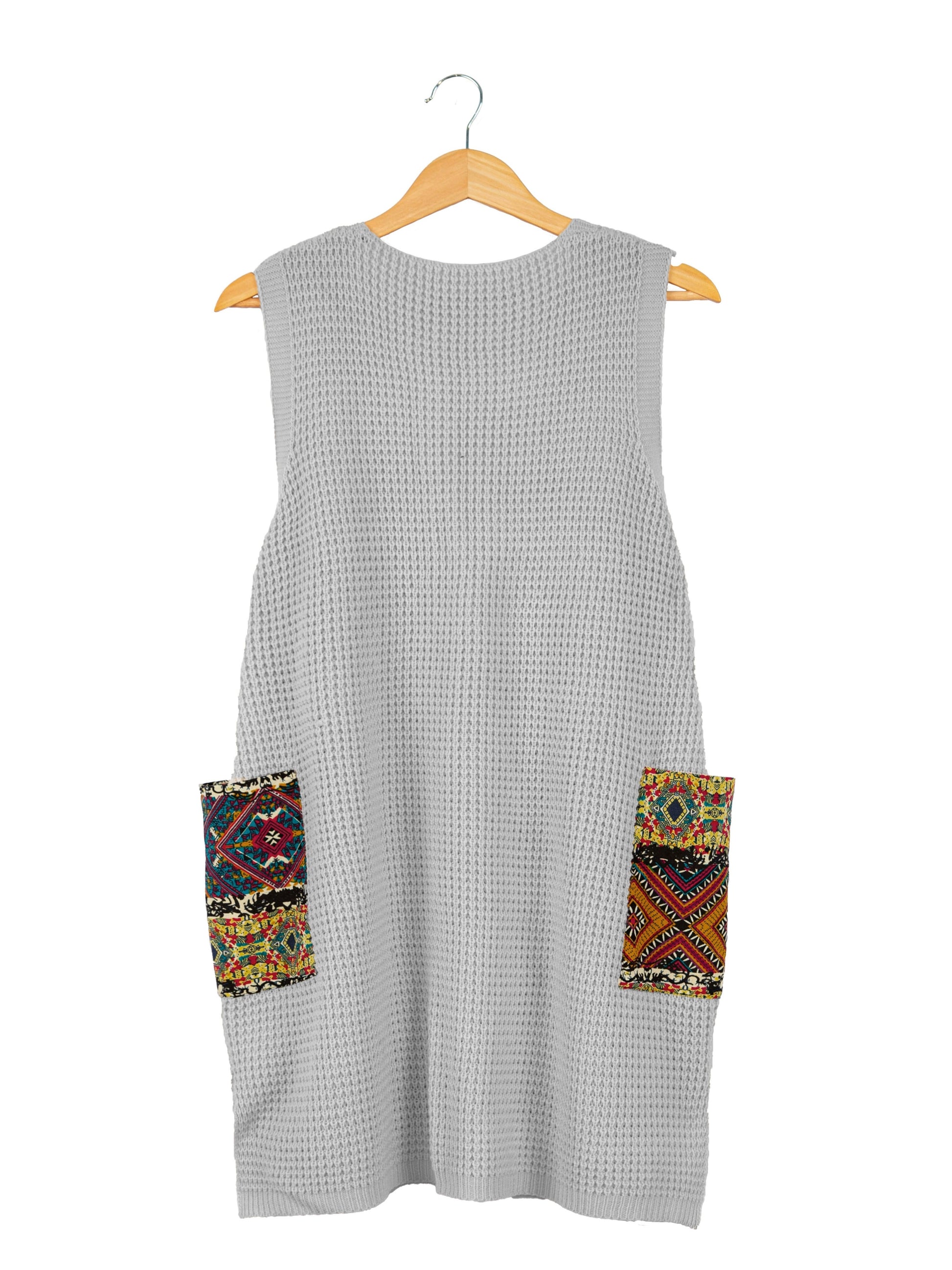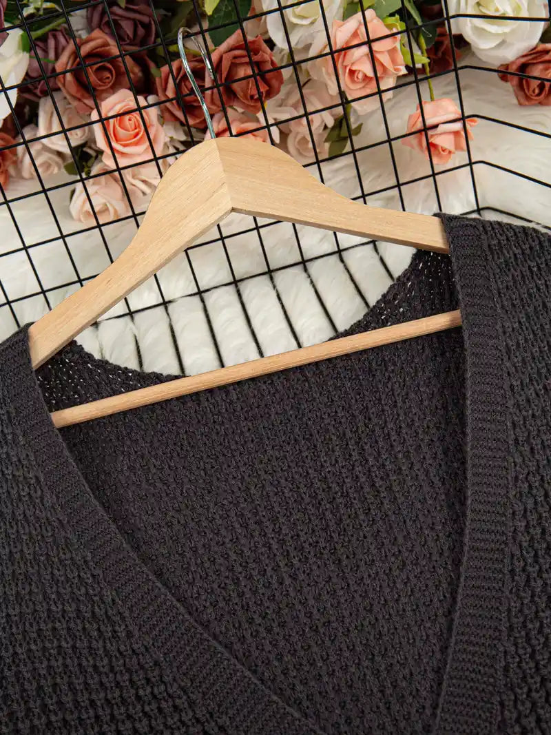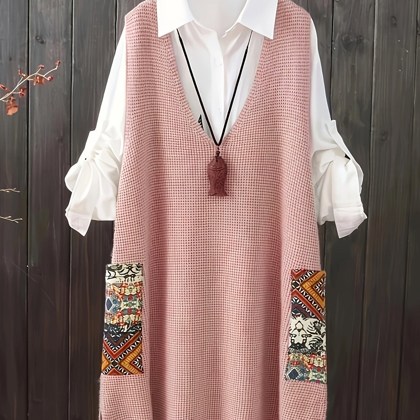 Vestido de suéter casual de talla grande con cuello en V y estampado con bolsillos