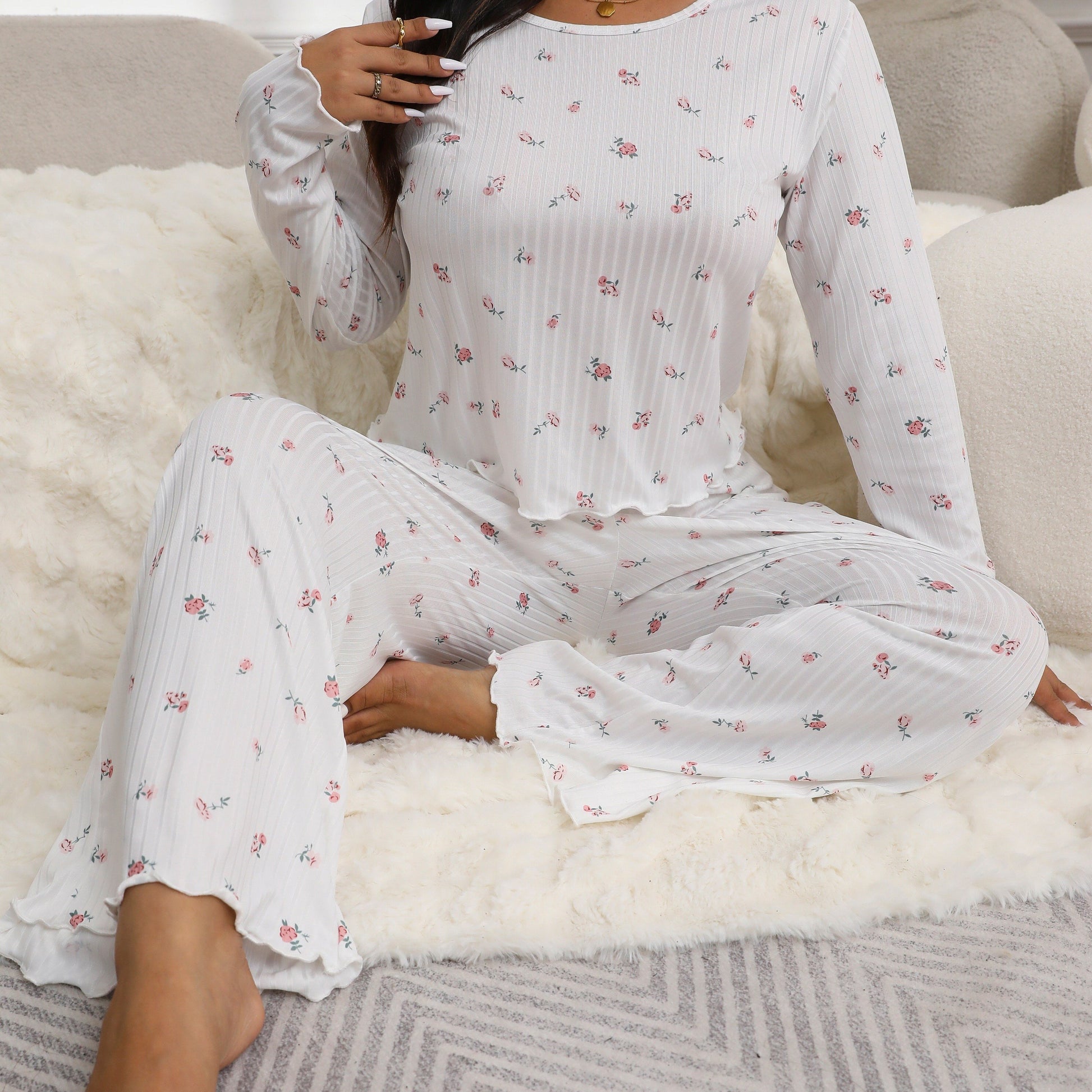Traje de pantalón de manga larga con estampado floral de tamaño grande y tela texturizada para otoño e invierno