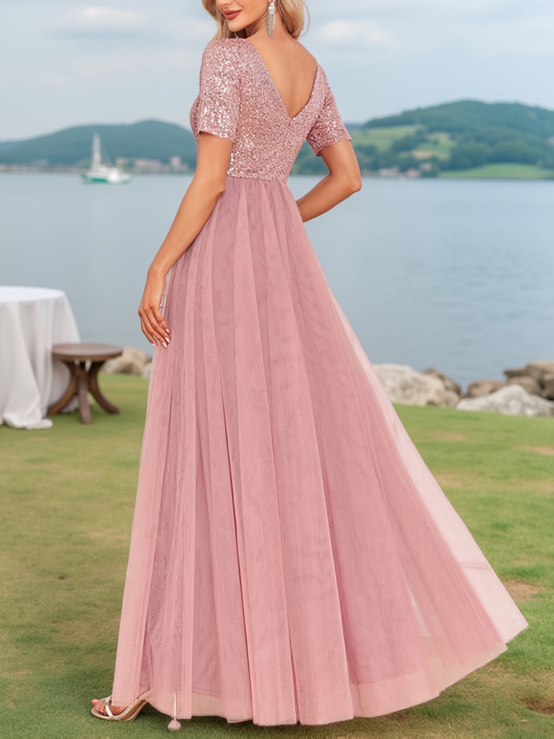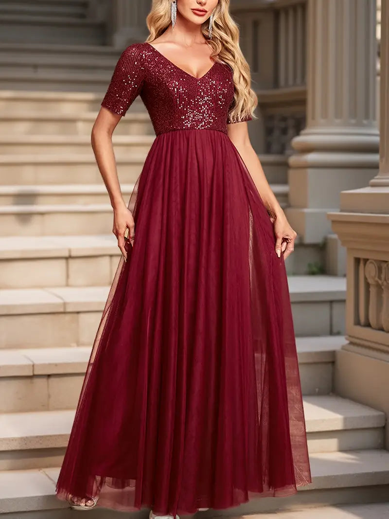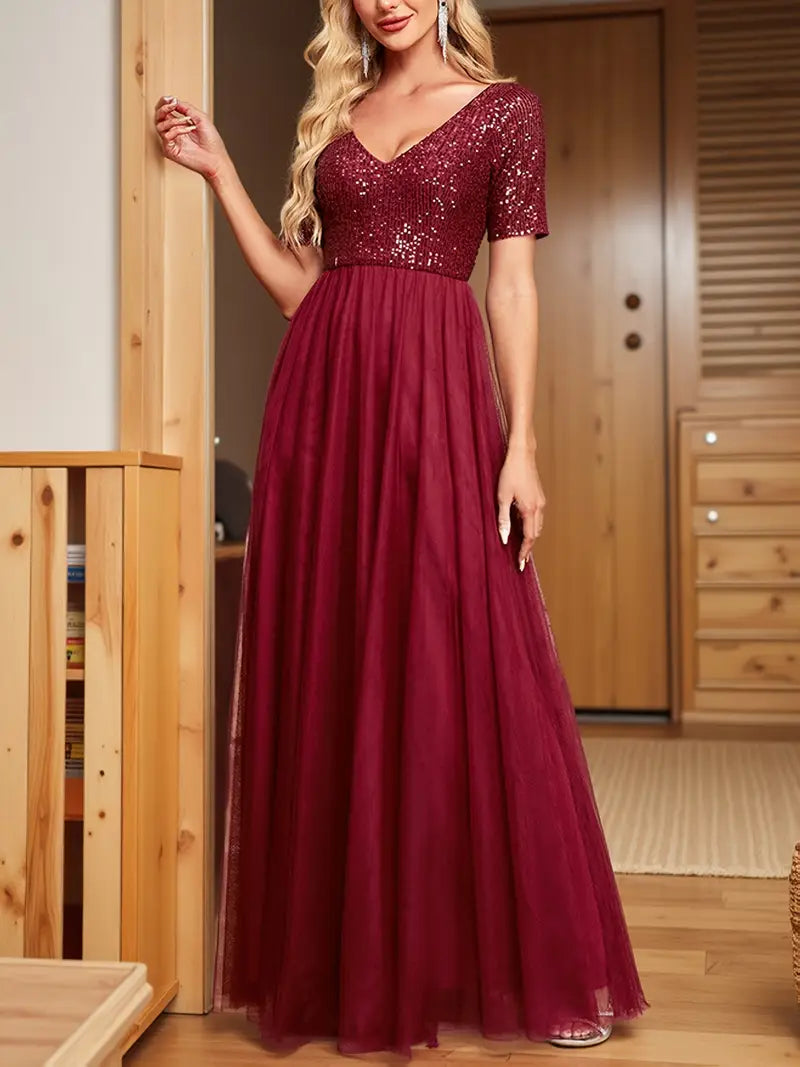Plus Size Sequin Mesh Evening Gown V-Neck A-Line Party Dress