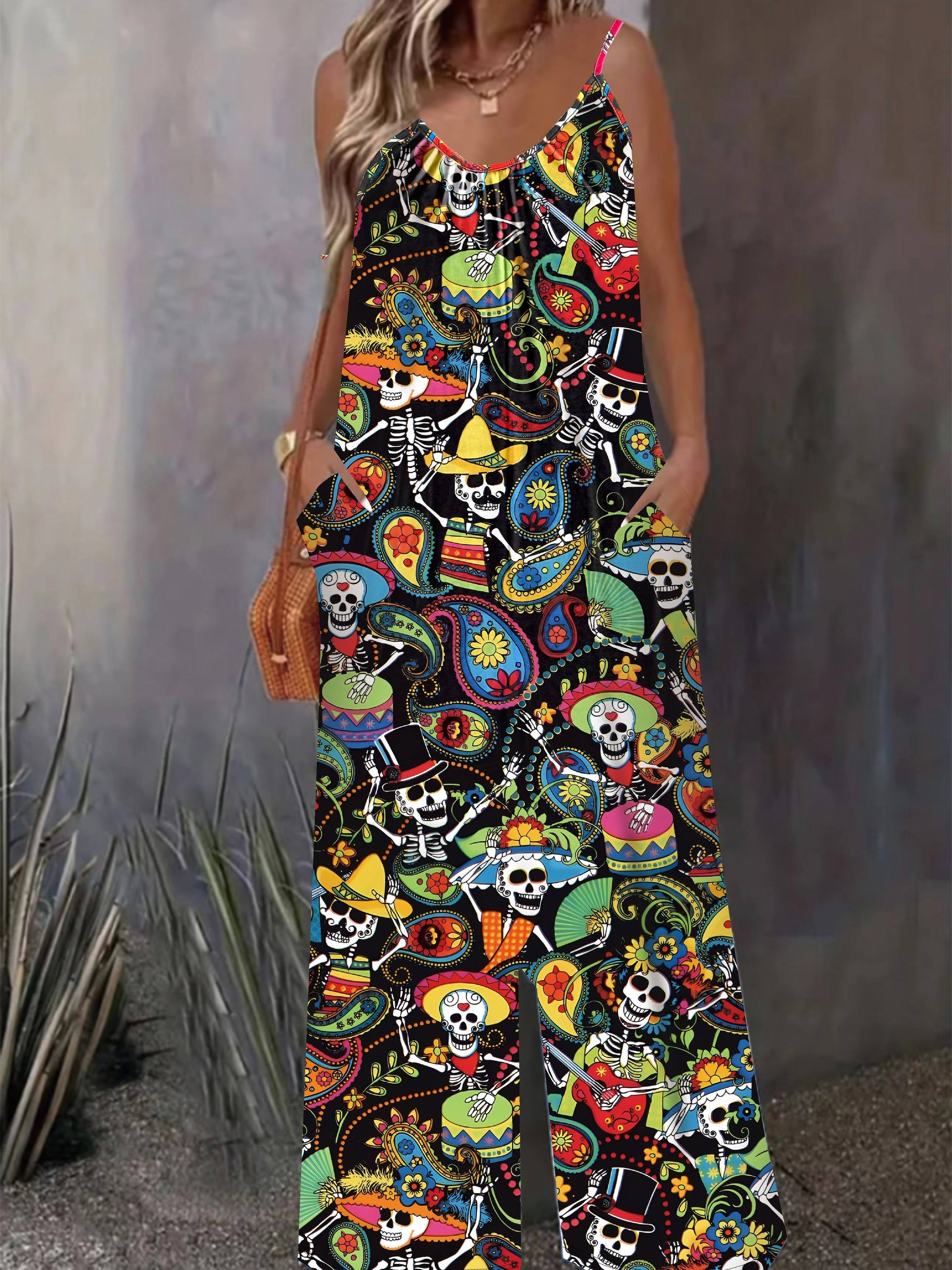 Mono corto casual sin mangas con estampado de calaveras en talla grande, con bolsillos y fruncido