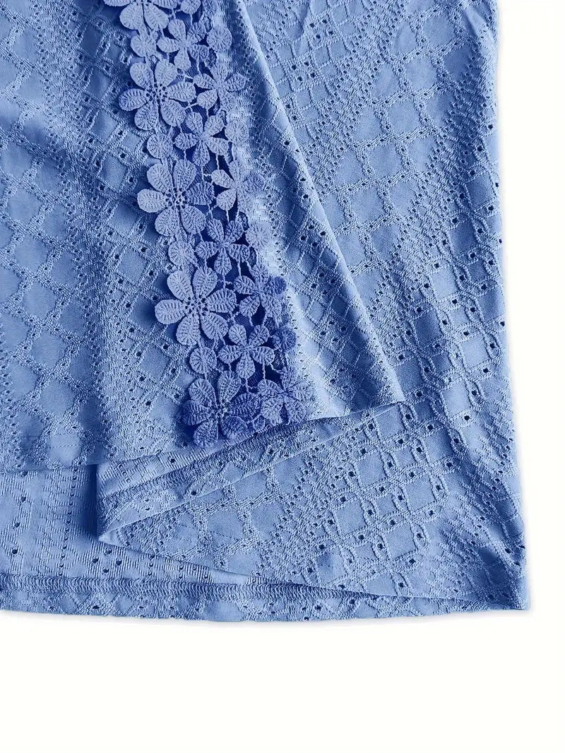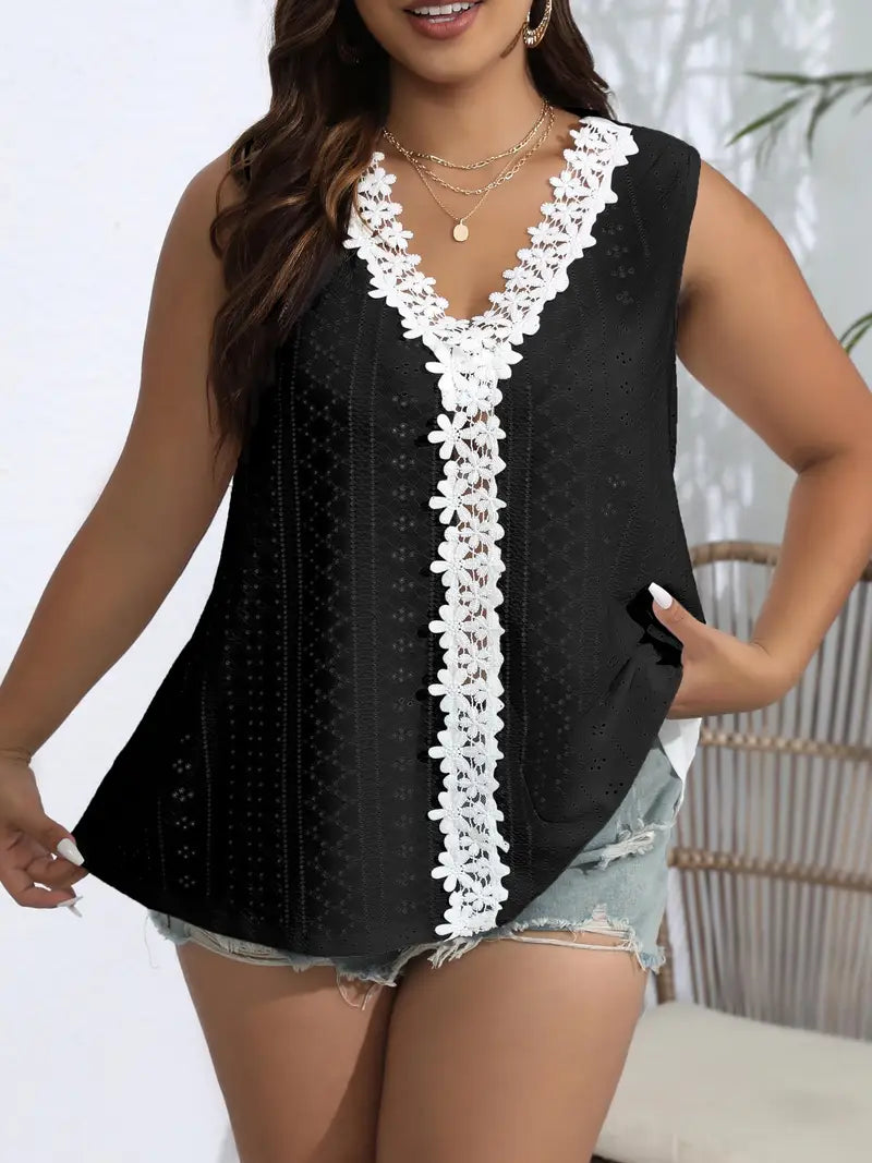 Top de tirantes casual para mujer de talla grande con escote en V, encaje, bordado y ojete, con estiramiento medio