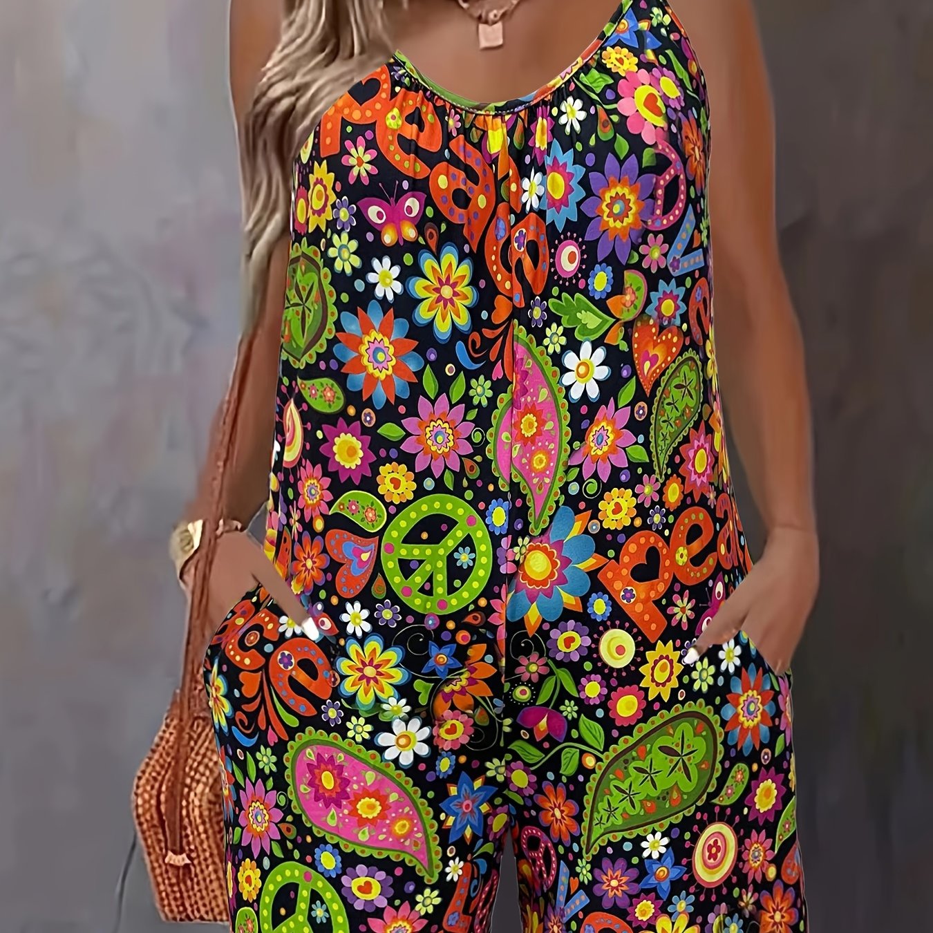 Mono sin mangas de talla grande para mujer con estampado floral y bolsillos