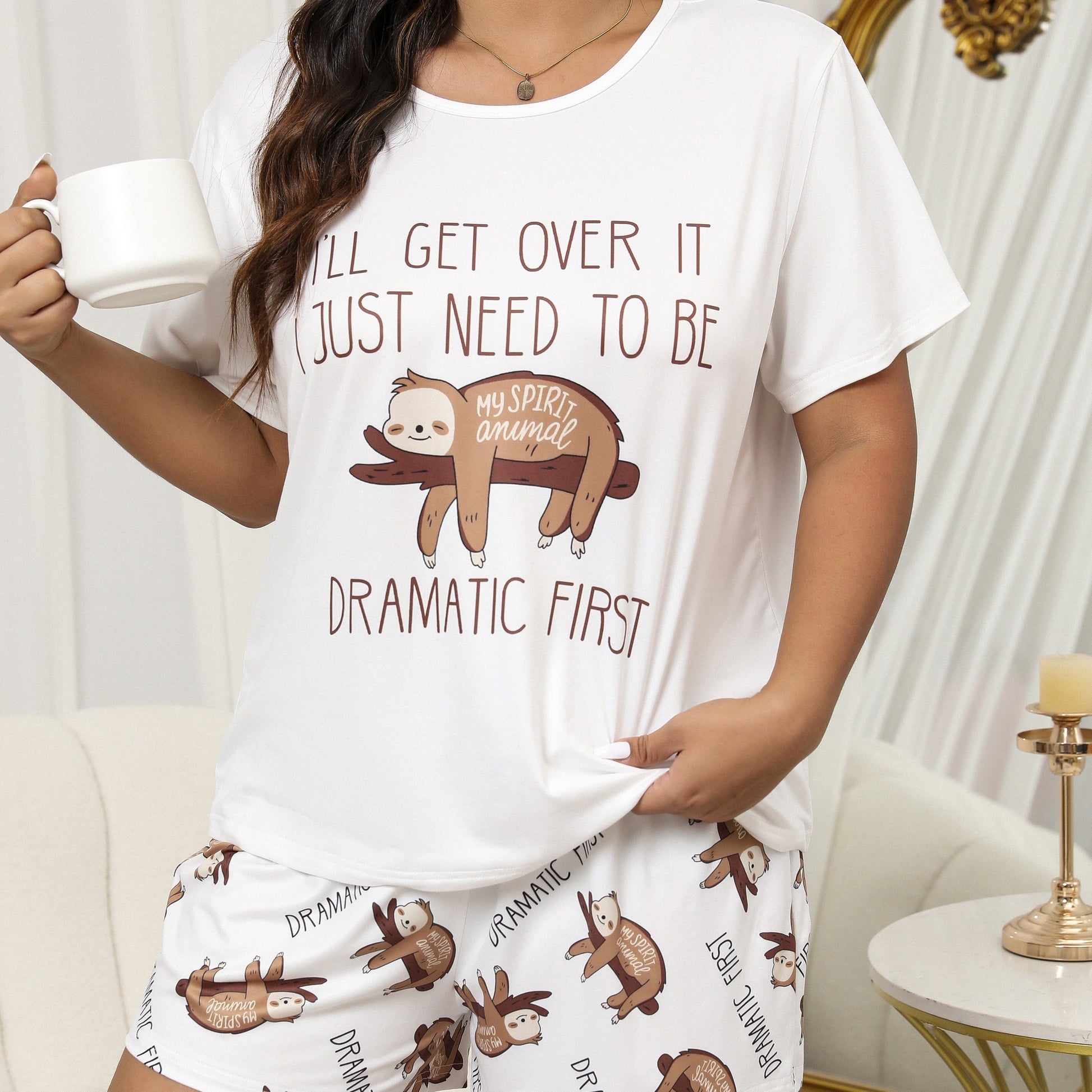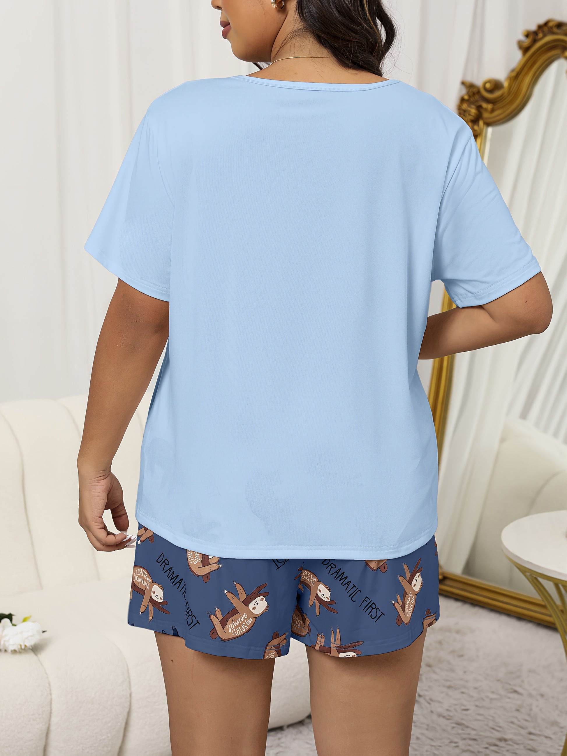 Plus Size Women's Sloth Print Pajama Set Light Blue Short Sleeve Shorts