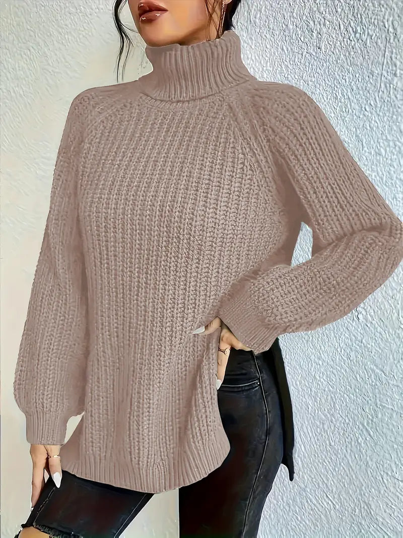 Suéter de cuello alto de color sólido para mujer talla grande con manga raglán para otoño e invierno