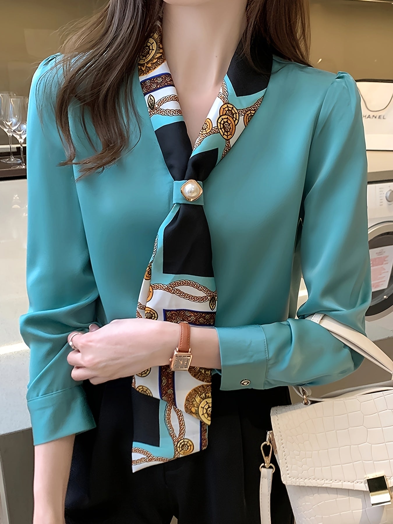 Blusa de mujer de poliéster con lazo en el cuello, manga larga, con botones y estampado en tejido.