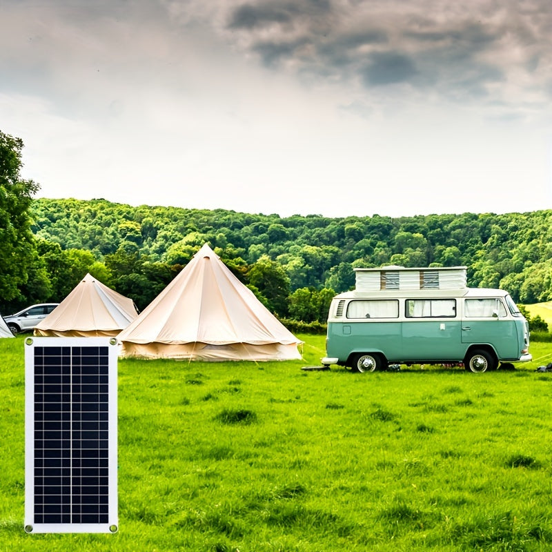 Kit de panel solar portátil con salidas de 12V y 18V, con interfaz de carga USB y controlador integrado. Este panel solar está equipado con células solares diseñadas para facilitar la recolección de energía y es adecuado para cargar teléfonos, autocaravanas, coches y otros dispositivos compatibles en movimiento.