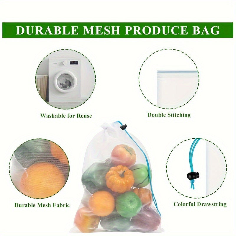 Juego de 10 bolsas de malla reutilizables para frutas y verduras lavables y transparentes