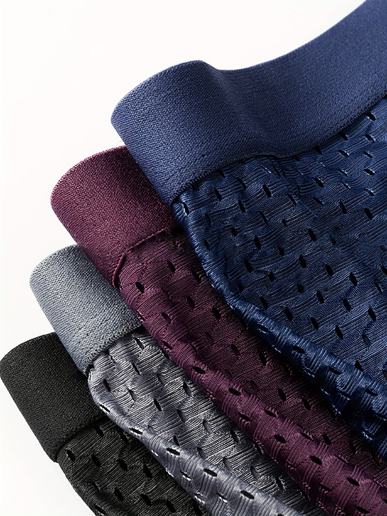 Set de 4 bóxers de malla transpirable para hombre, de color sólido semi-translúcido, con alto contenido de elastano en poliéster