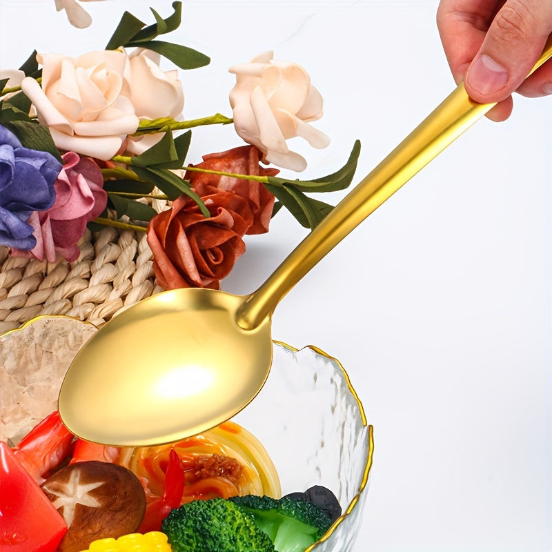 Juego de 6 utensilios de cocina de acero inoxidable en dorado, negro y plateado incluye espátula, cuchara para arroz, colador y cuchara para sopa