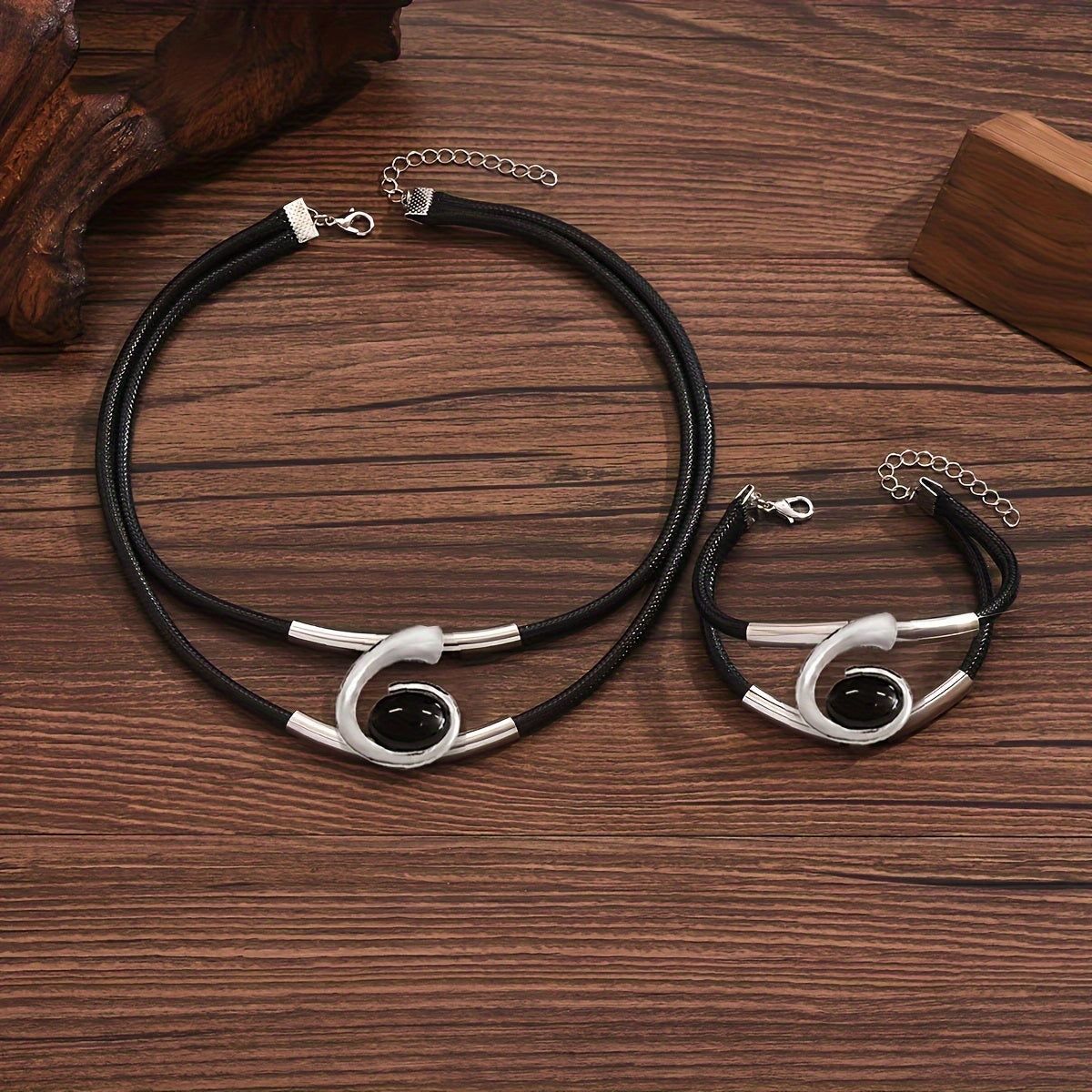 Conjunto de joyería de cuerda trenzada de imitación de PU negro con collar y pulseras de espiral geométrica para mujeres