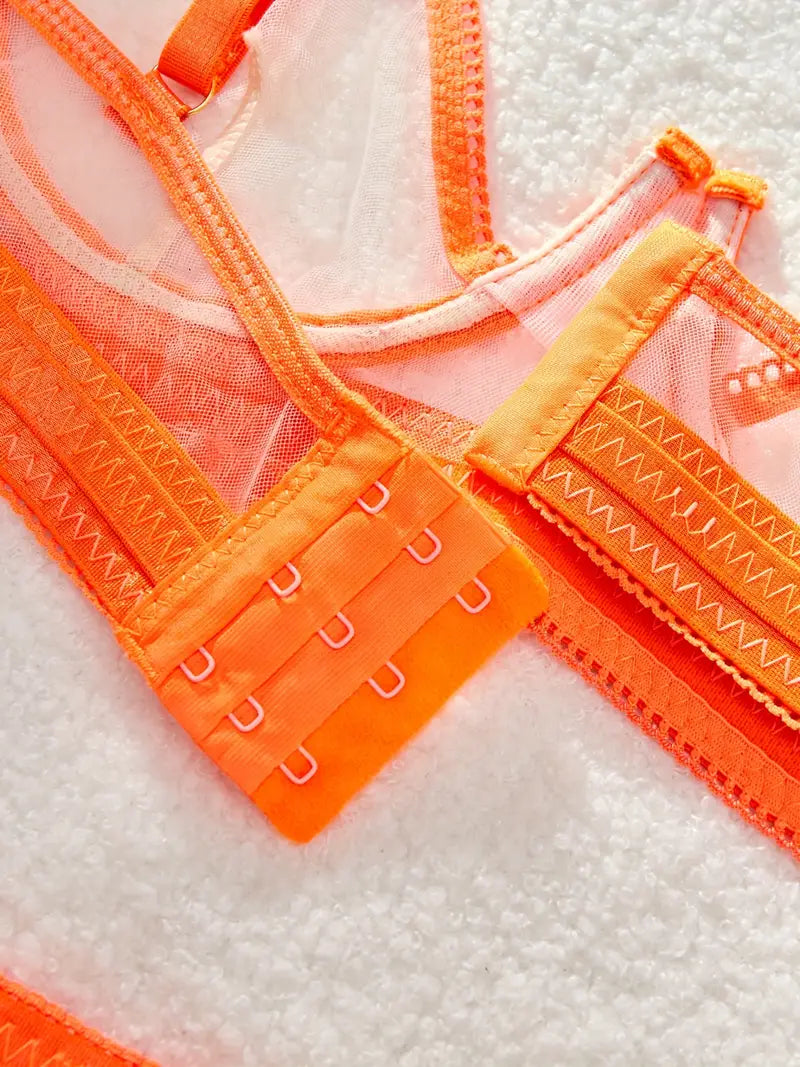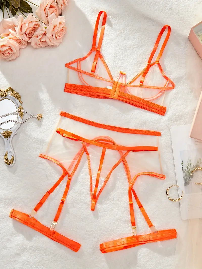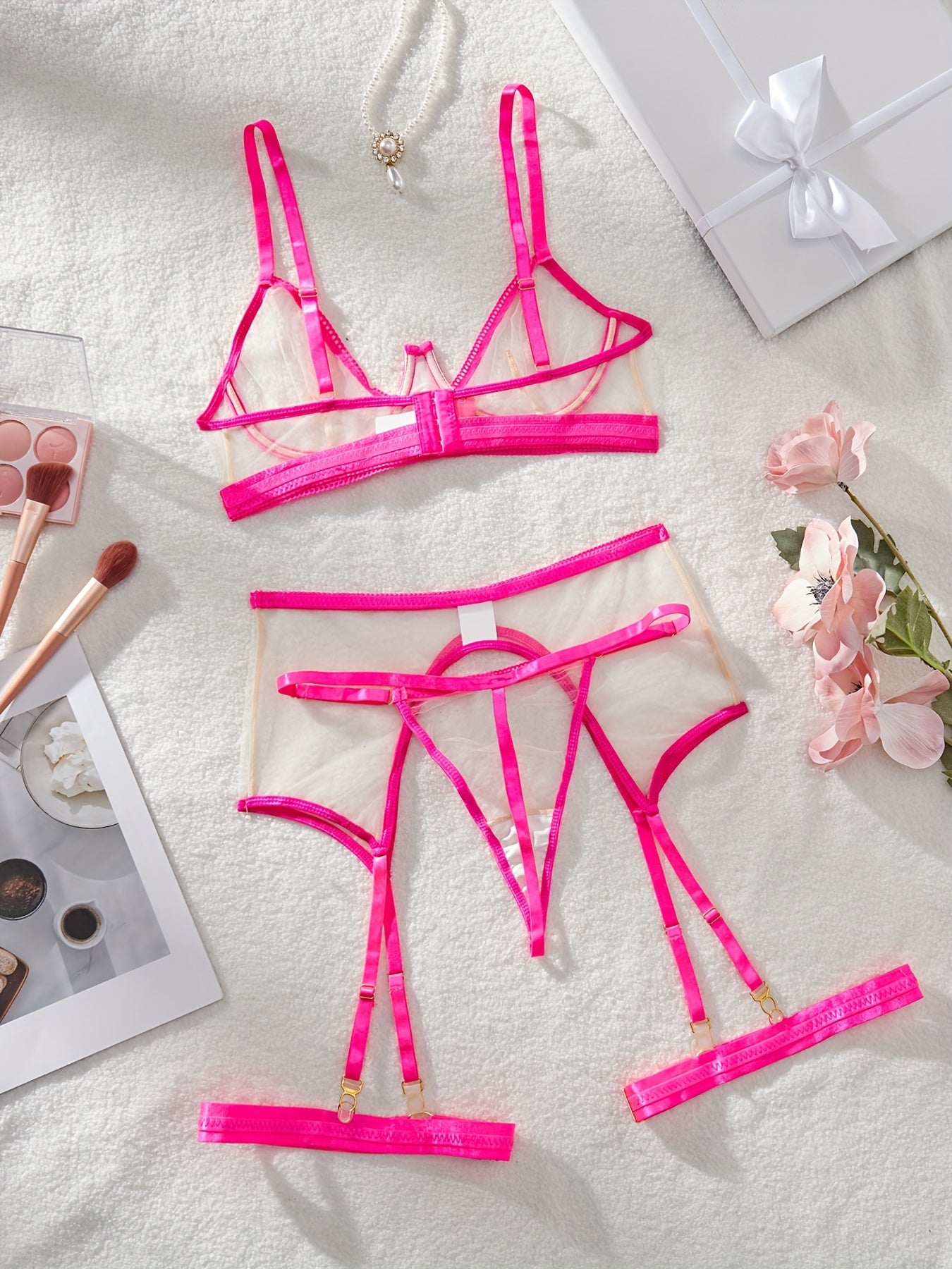 Conjunto de lencería de malla transparente para mujer con sujetador, tanga y liga con ribete en contraste
