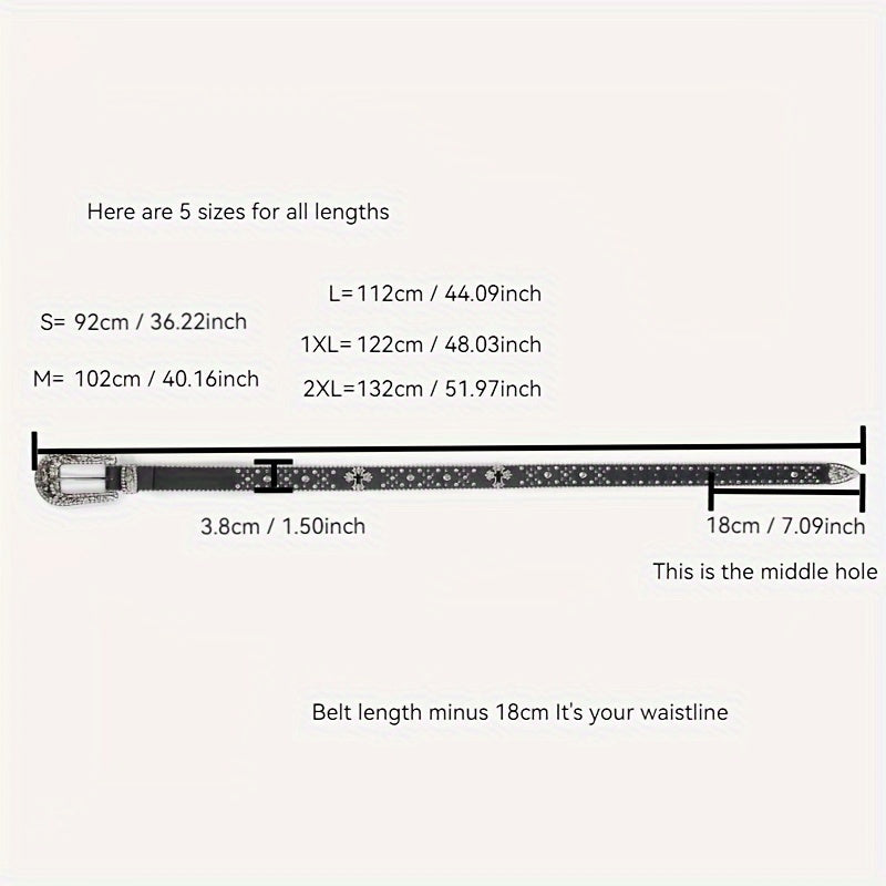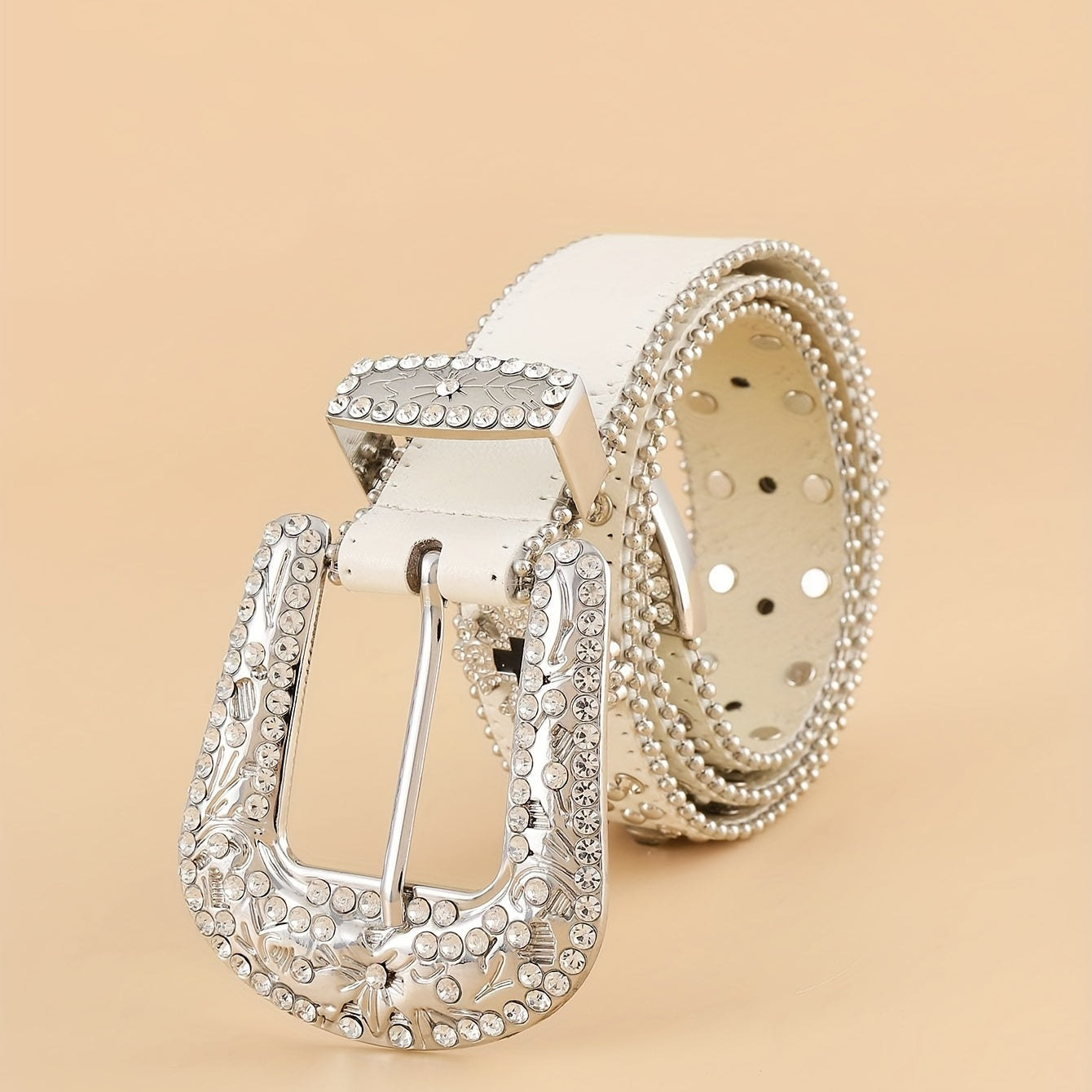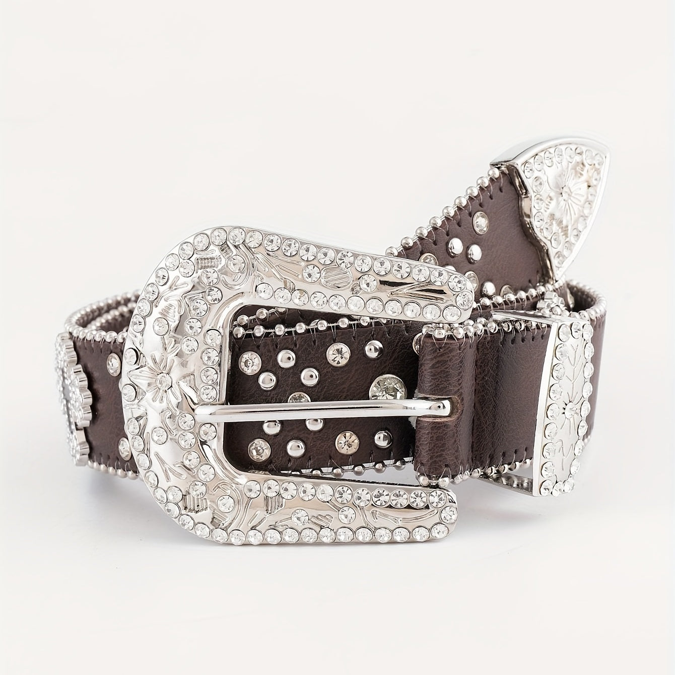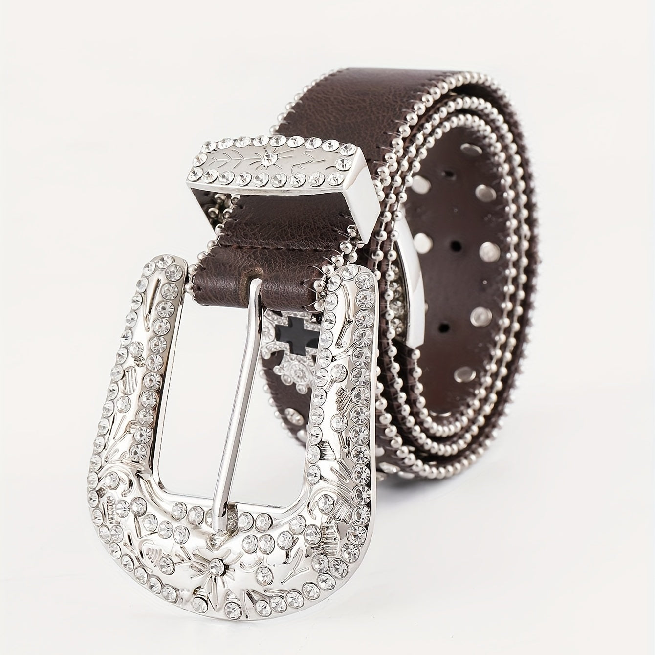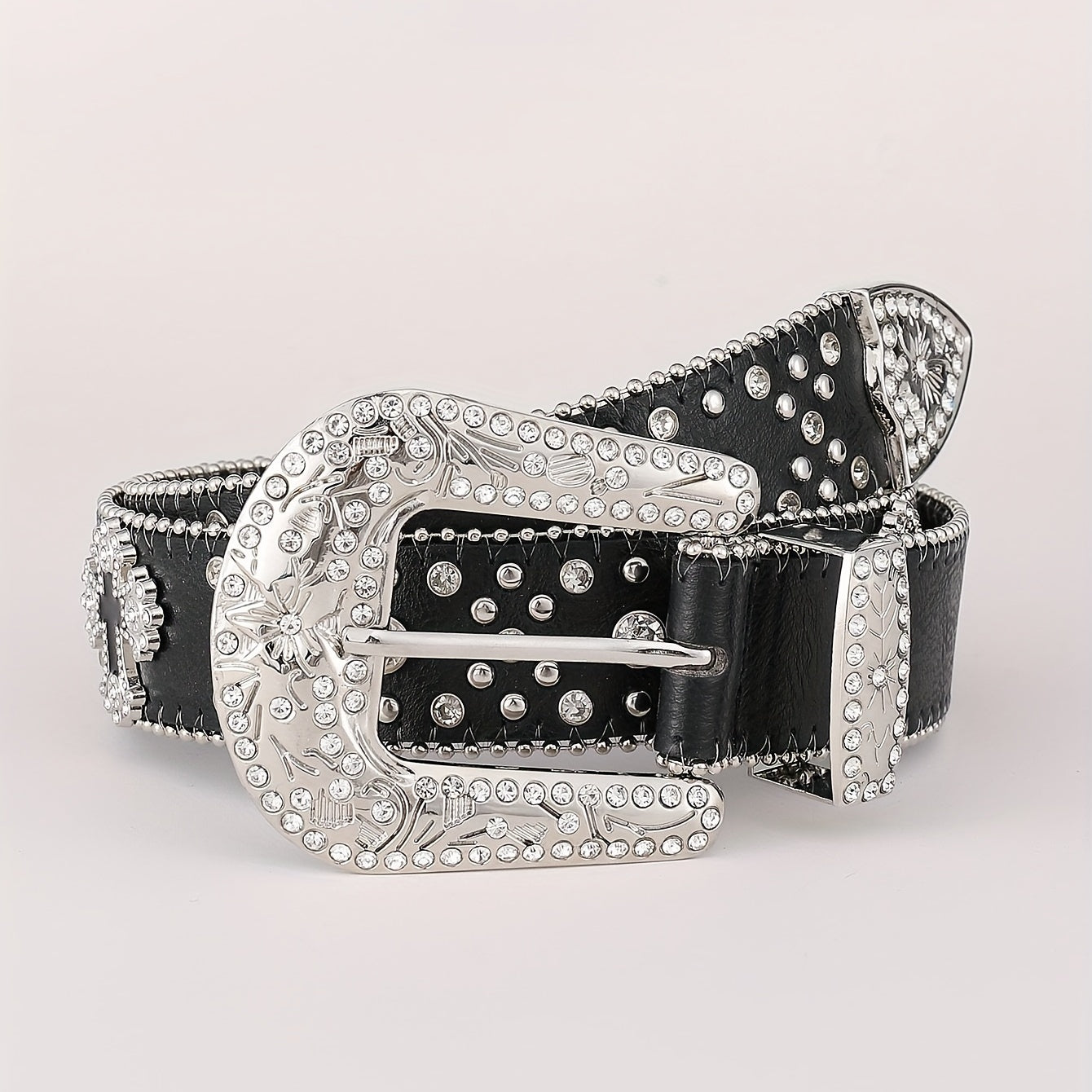 Cinturón unisex de cuero brillante con incrustaciones de rhinestones, hebilla tallada, remaches cruzados y diseño con tachuelas para hip hop, Y2K, vaqueros y pantalones