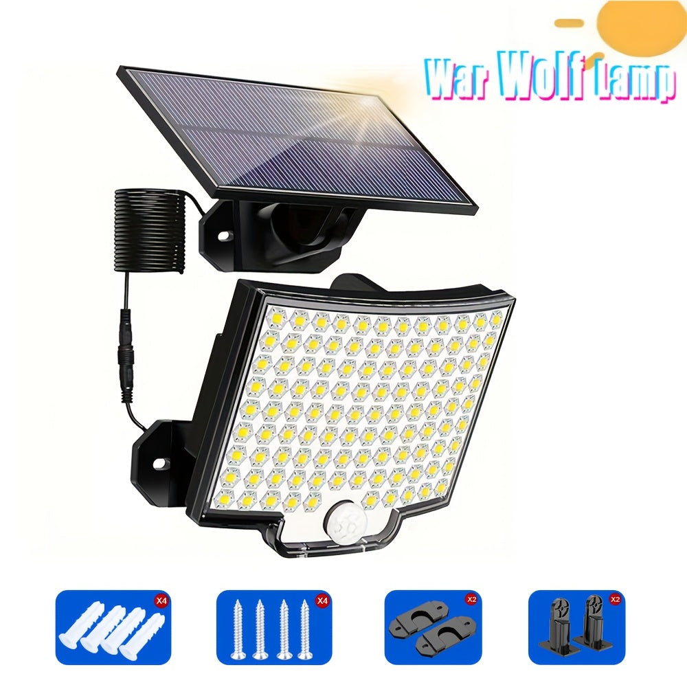 Luz de pared solar con 106 LEDs, sensor de movimiento, ángulo ajustable, cable de 279cm para patio y jardín