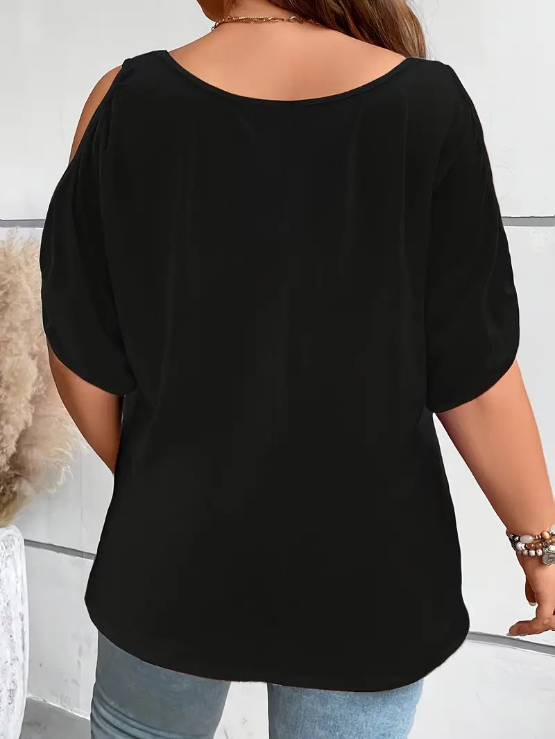 Camiseta de manga corta de hombro frío en talla grande para mujer, casual, con cuello redondo, poliéster
