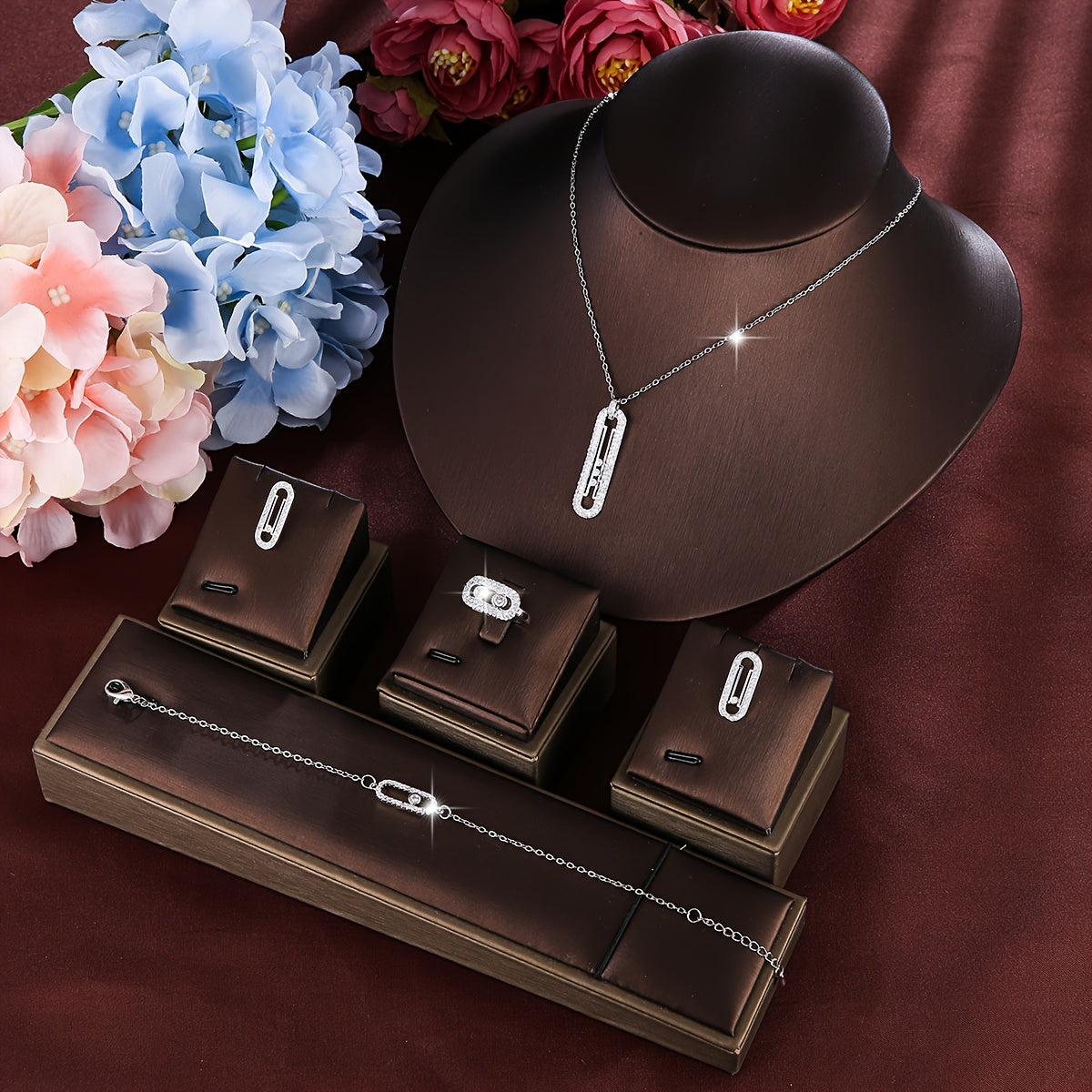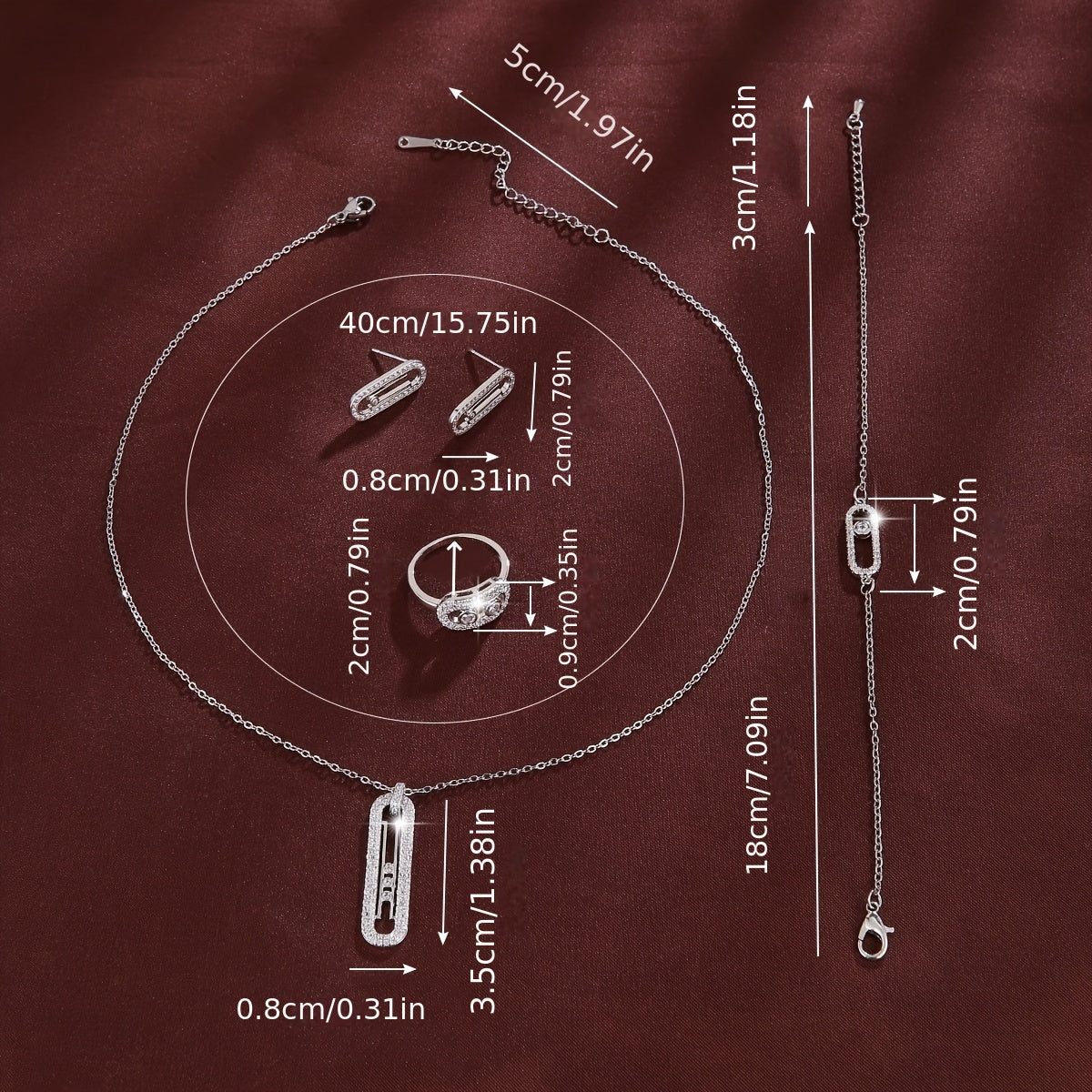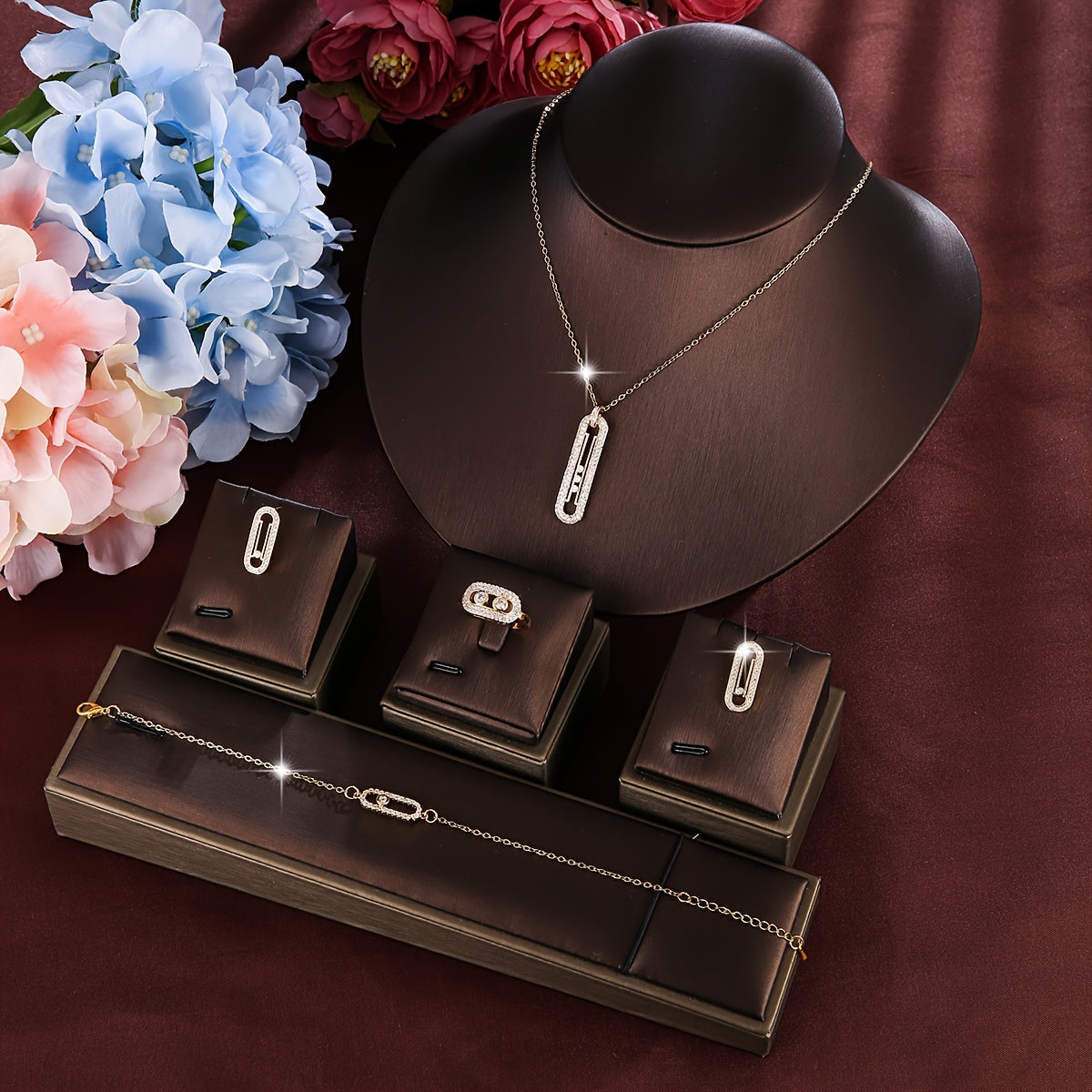 Conjunto de joyería de cobre con pendientes de zirconia, collar, anillo y pulsera estilo coreano