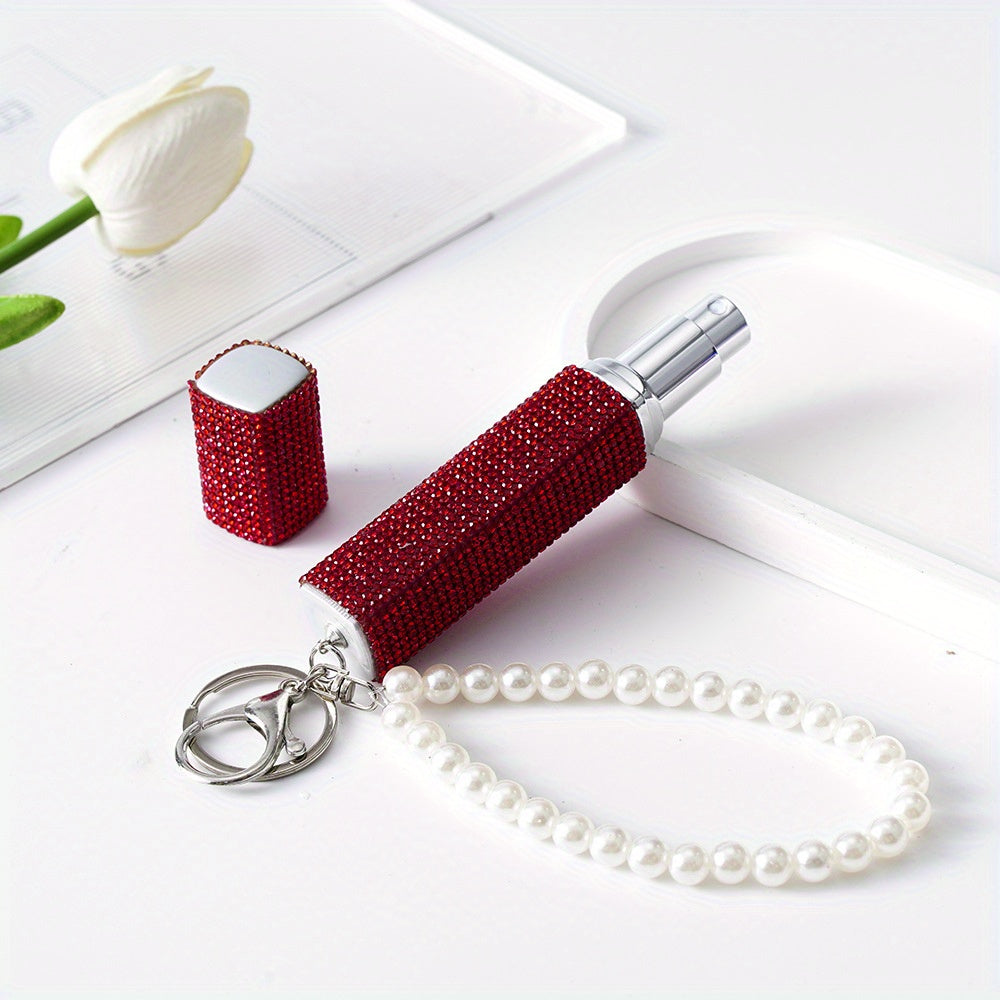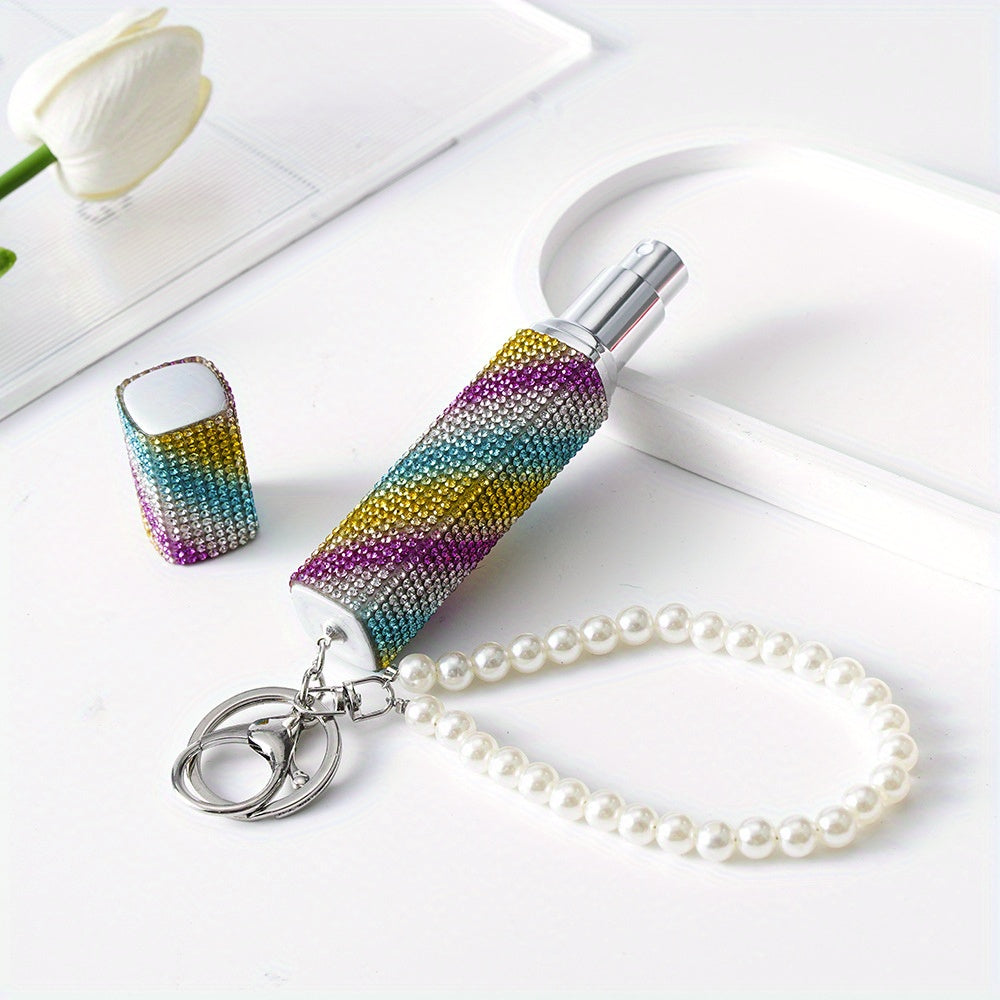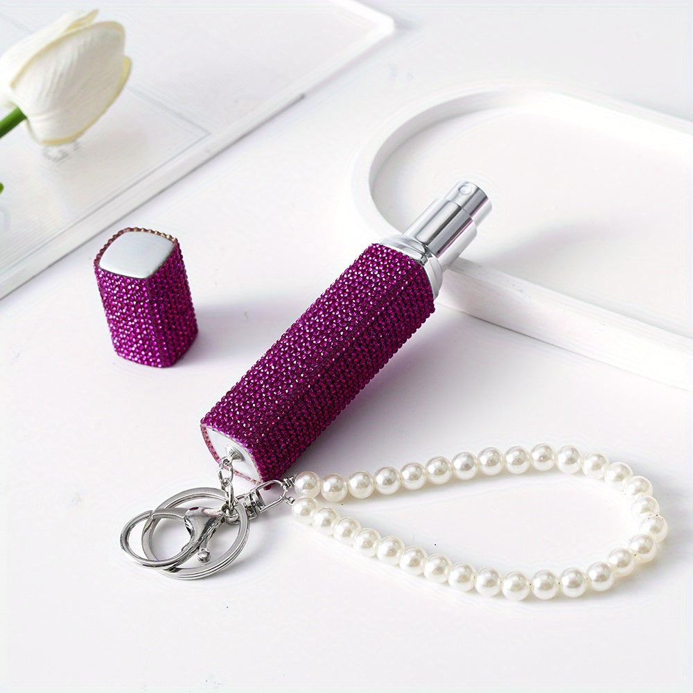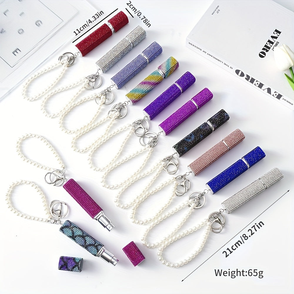 Llavero atomizador de perfume de 10ml con piedras de imitación y perlas falsas, recargable, bomba de aroma de viaje para mujeres