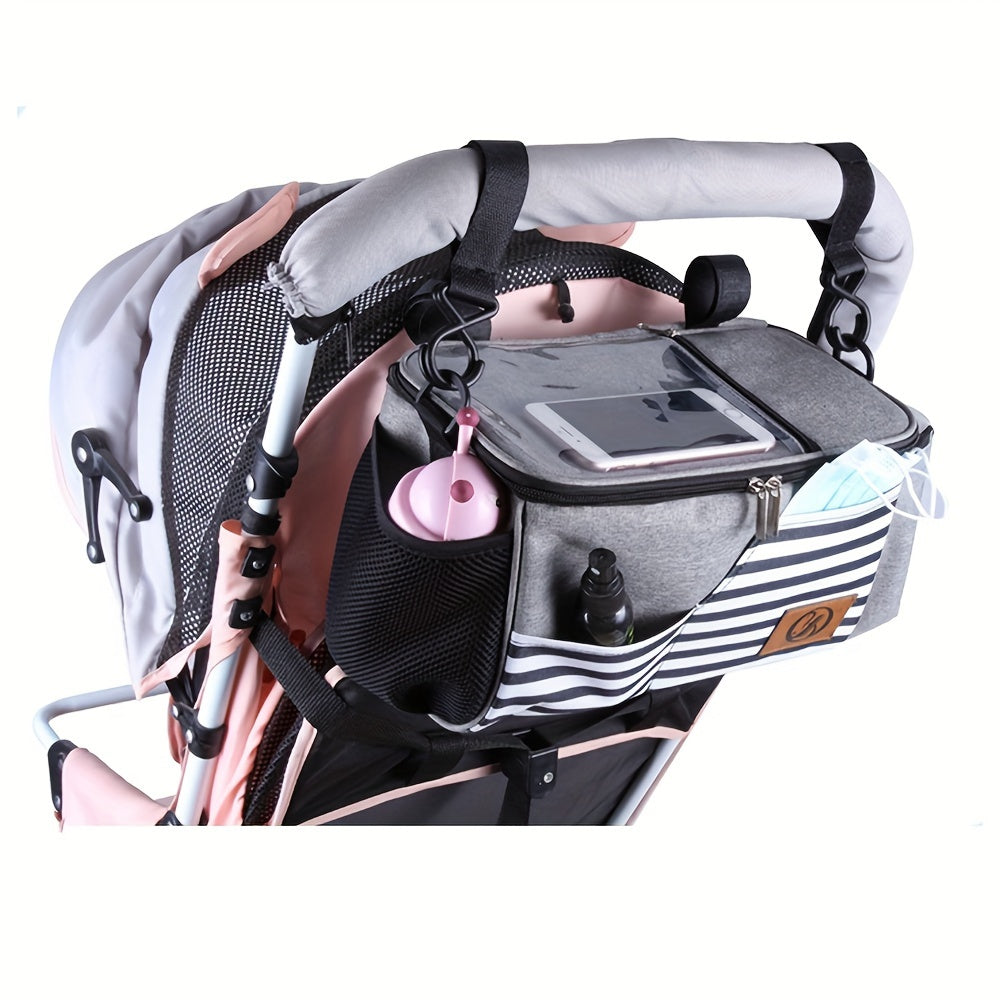 Bolsa organizadora para cochecito con portavasos, bolsillo con pantalla táctil, gran capacidad, almacenamiento para pañales