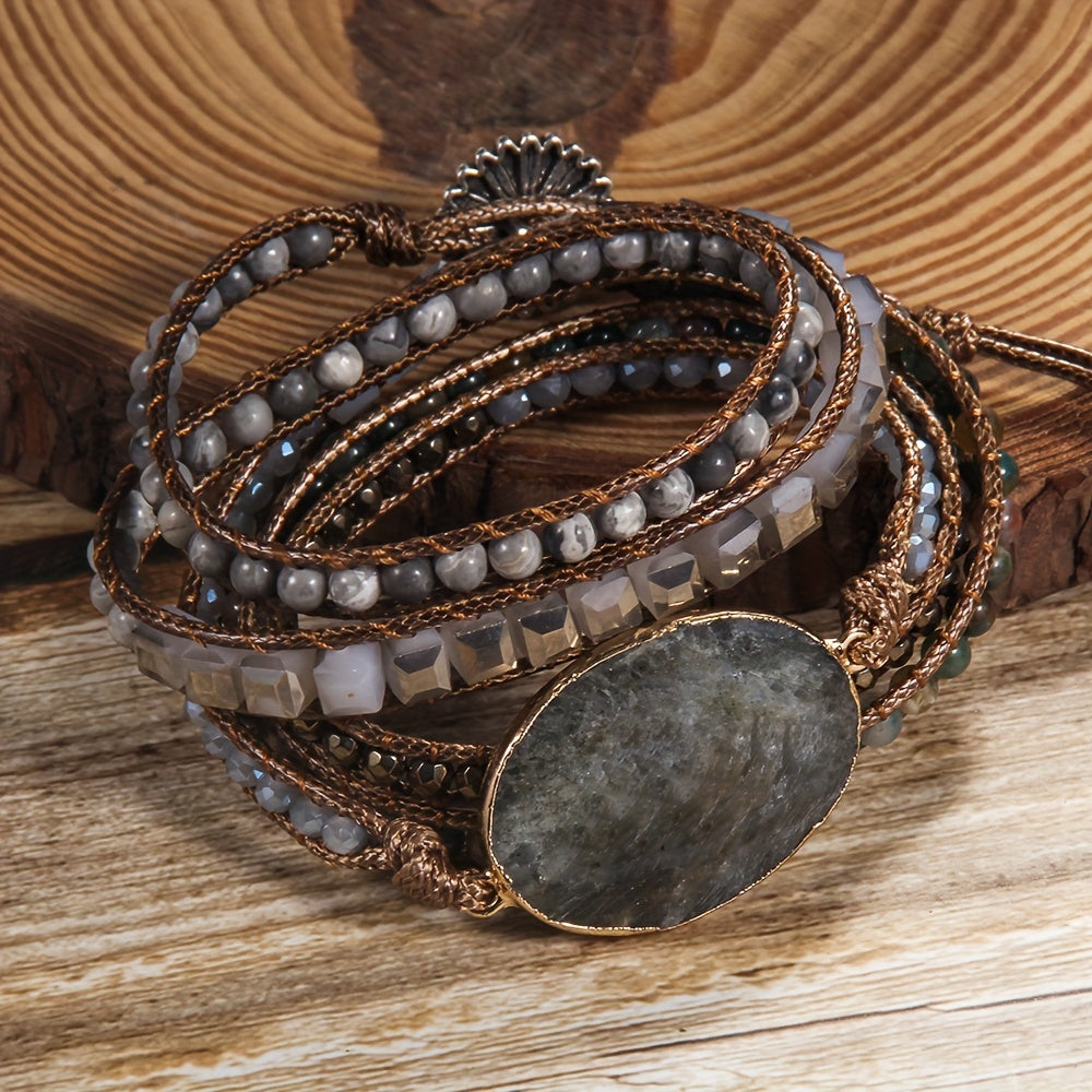 Pulsera ajustable bohemia de vacaciones con cuentas de piedra natural, hematita de vidrio, 5 hilos, corazón naranja, conexión gris