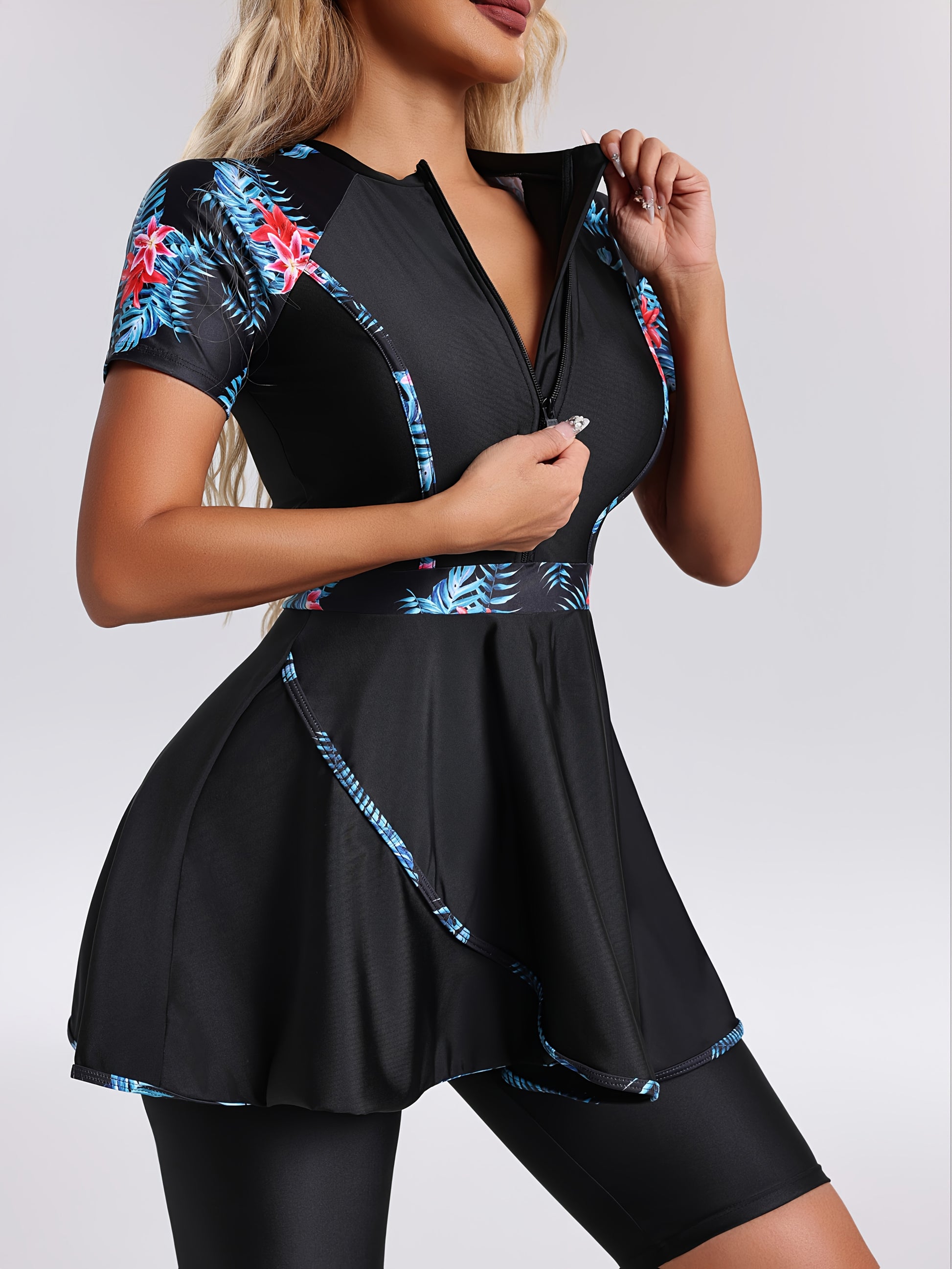Conjunto de bañador atlético con estampado tropical para mujer, cuello alto, almohadillas removibles, poliéster y elastano