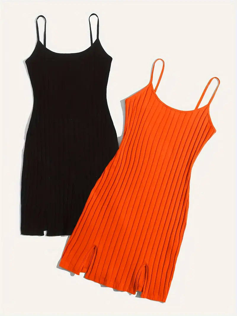 Vestidos de descanso de canalé para mujer de color sólido con cuello redondo y abertura, tejido de punto para todas las estaciones