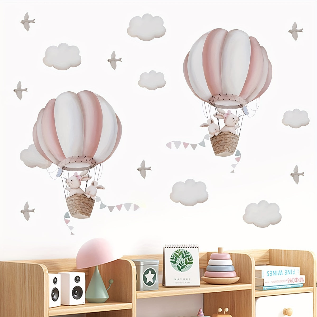 Adhesivos de pared para pequeños conejos, nubes y pájaros en globos aerostáticos, decoración para dormitorio y sala de estar
