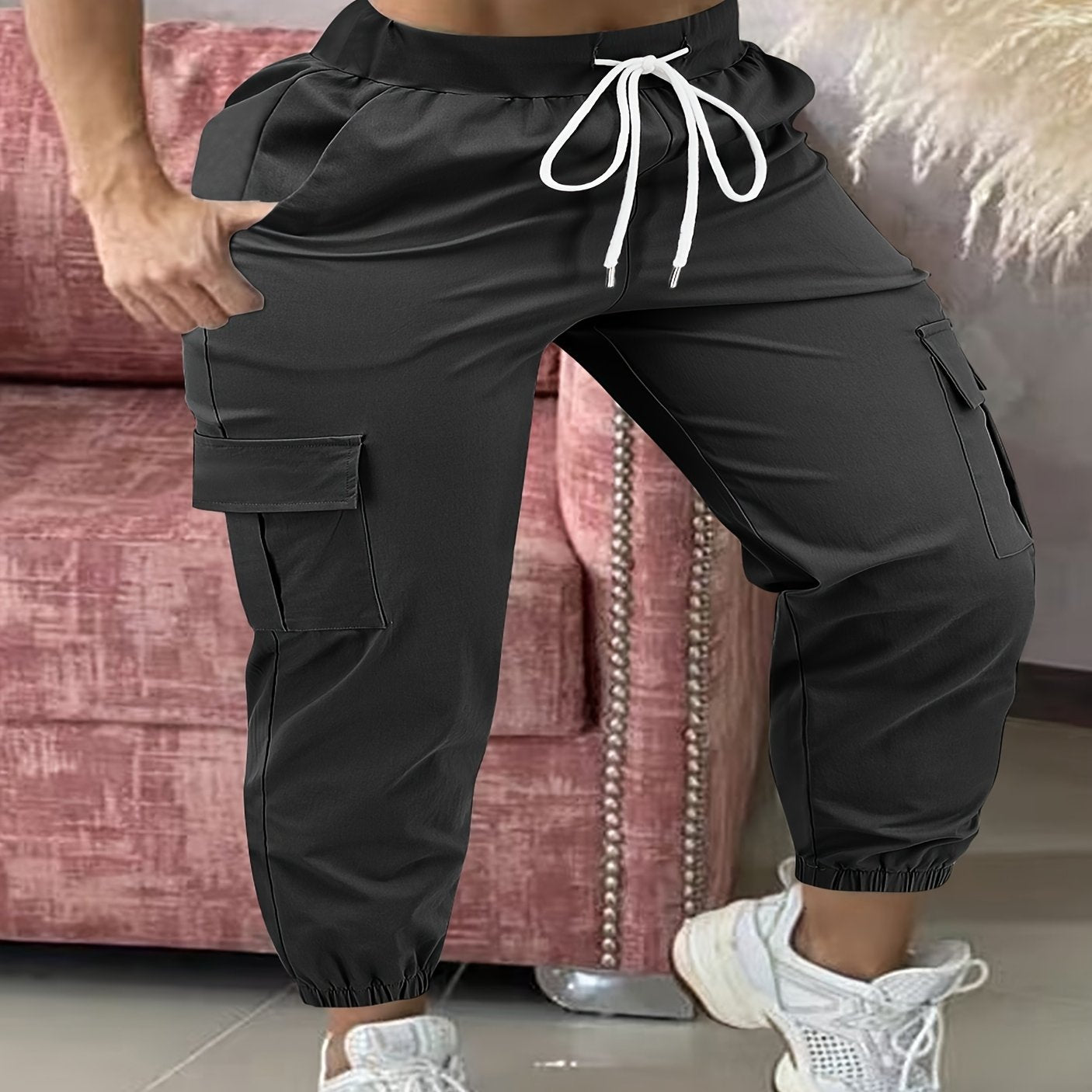Pantalones cargo de talla grande para mujer en color verde oliva, casuales, con cinturilla ajustable, para todas las estaciones