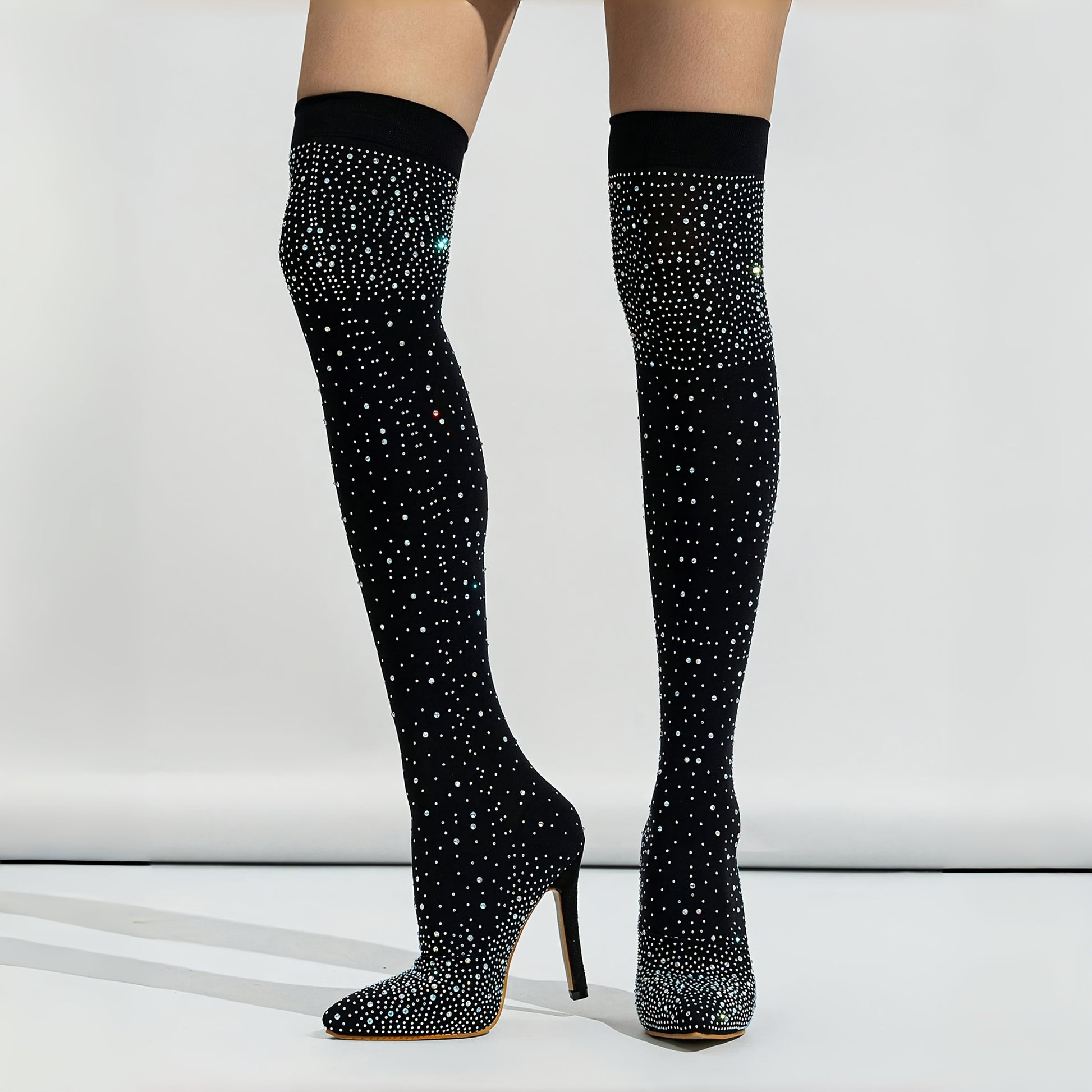 Women's Mesh Over-the-Knee Boots with Rhinestones Black Stiletto Heels