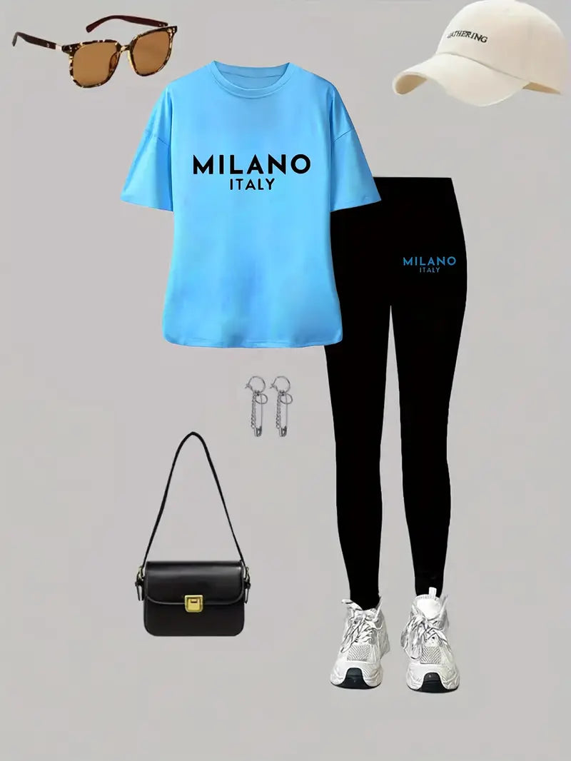 Conjunto de camiseta gráfica y leggings de talla grande para mujer, poliéster, casual