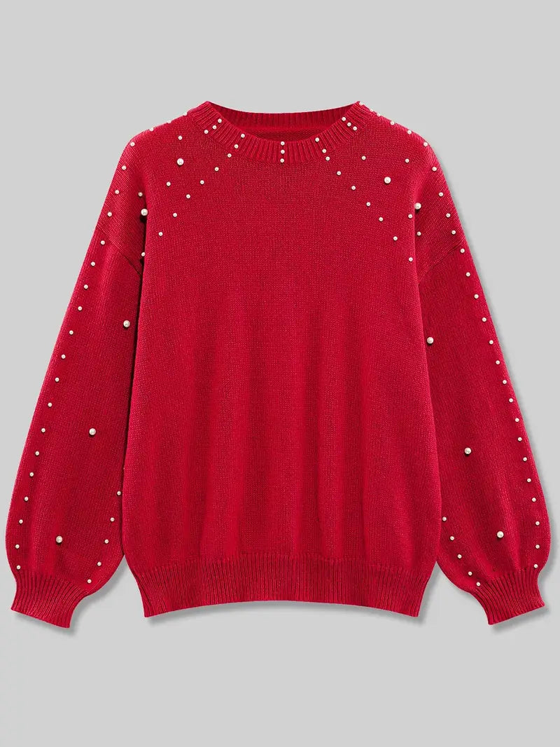 Suéter de punto para mujer talla plus, otoño e invierno, cuello redondo, decoración de perlas