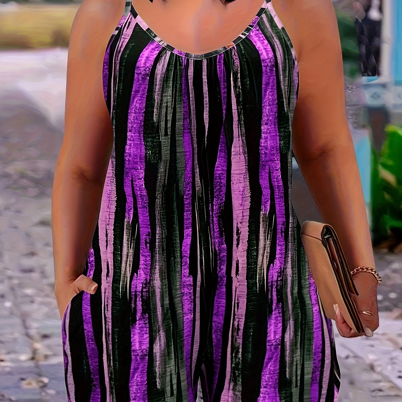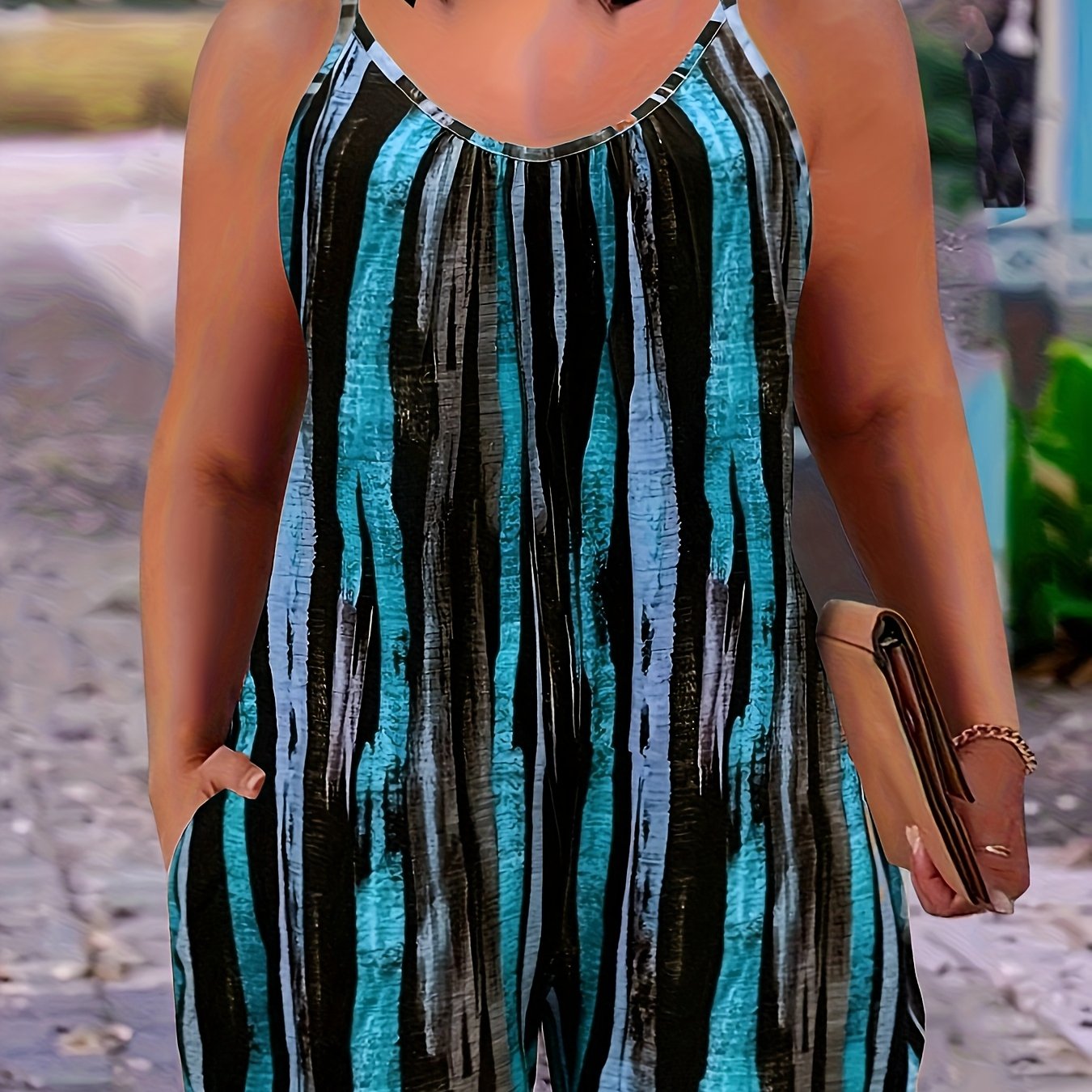 Mono sin mangas de talla grande para mujer con estampado a rayas y bolsillos
