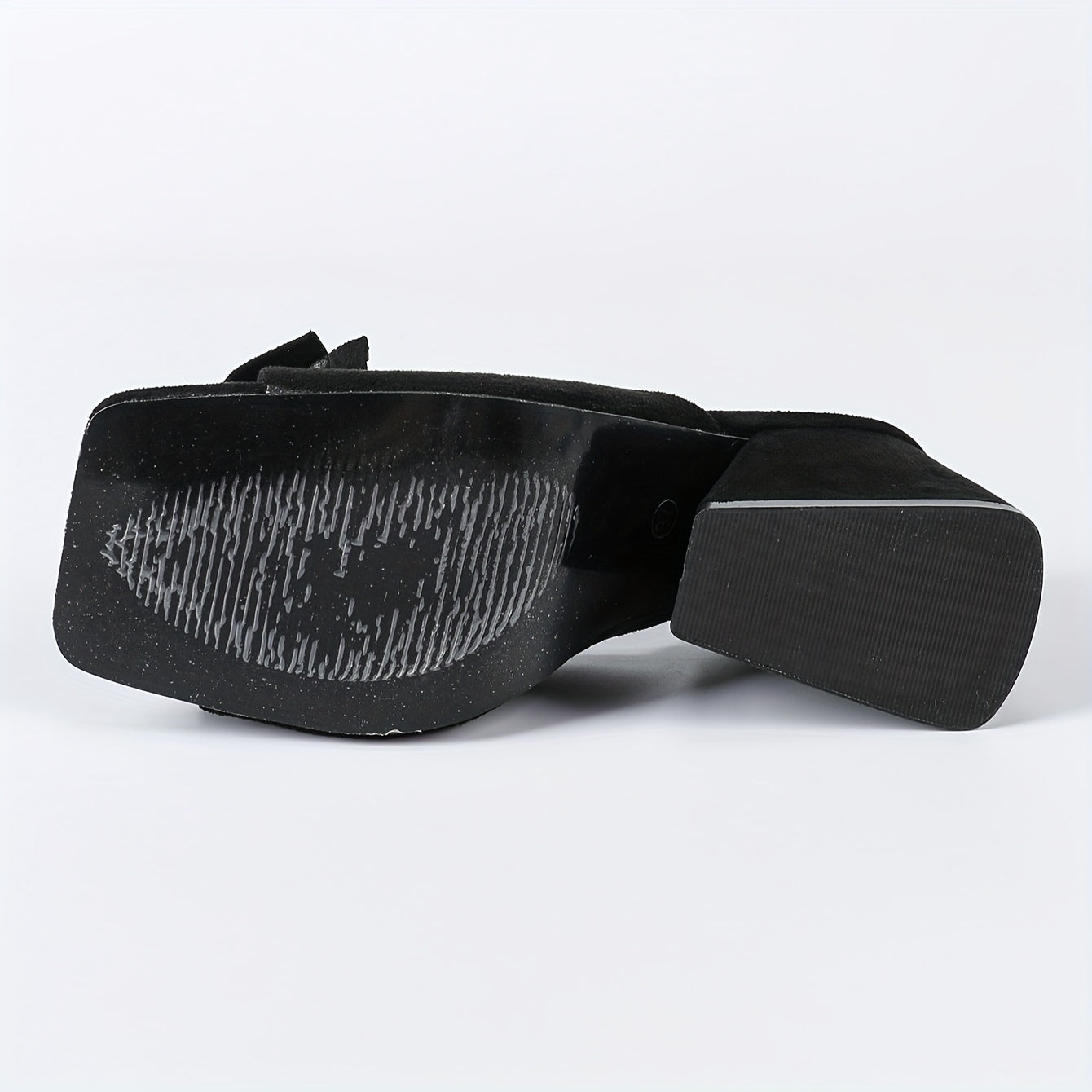 Women's Summer Black Chunky Heel Open Toe Mules with Knit Slip-Ons
