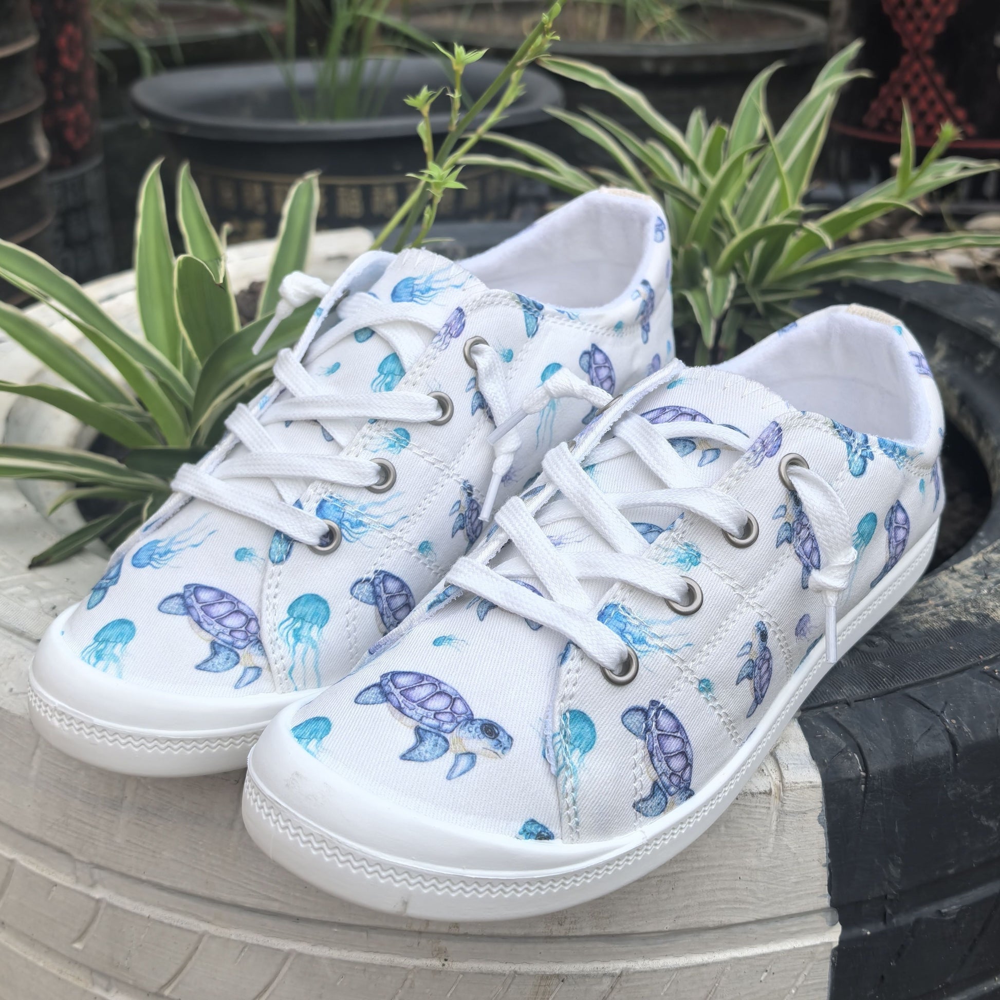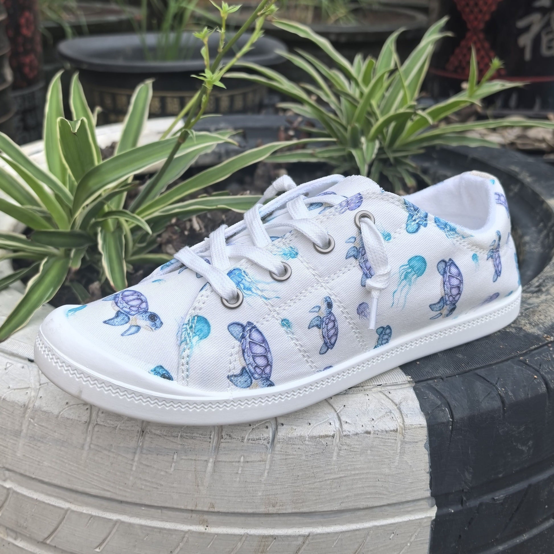 Women's White Jellyfish and Sea Turtle Print Casual Sneakers Breathable Flat Shoes