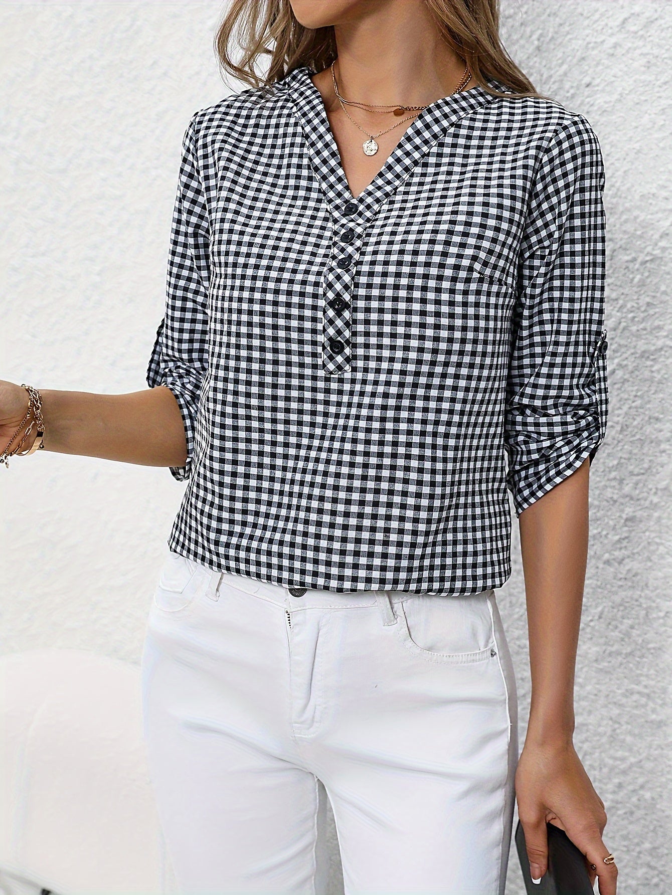 Camisa de mujer a cuadros en amarillo y blanco con botones y cuello en V, manga larga, poliéster, casual