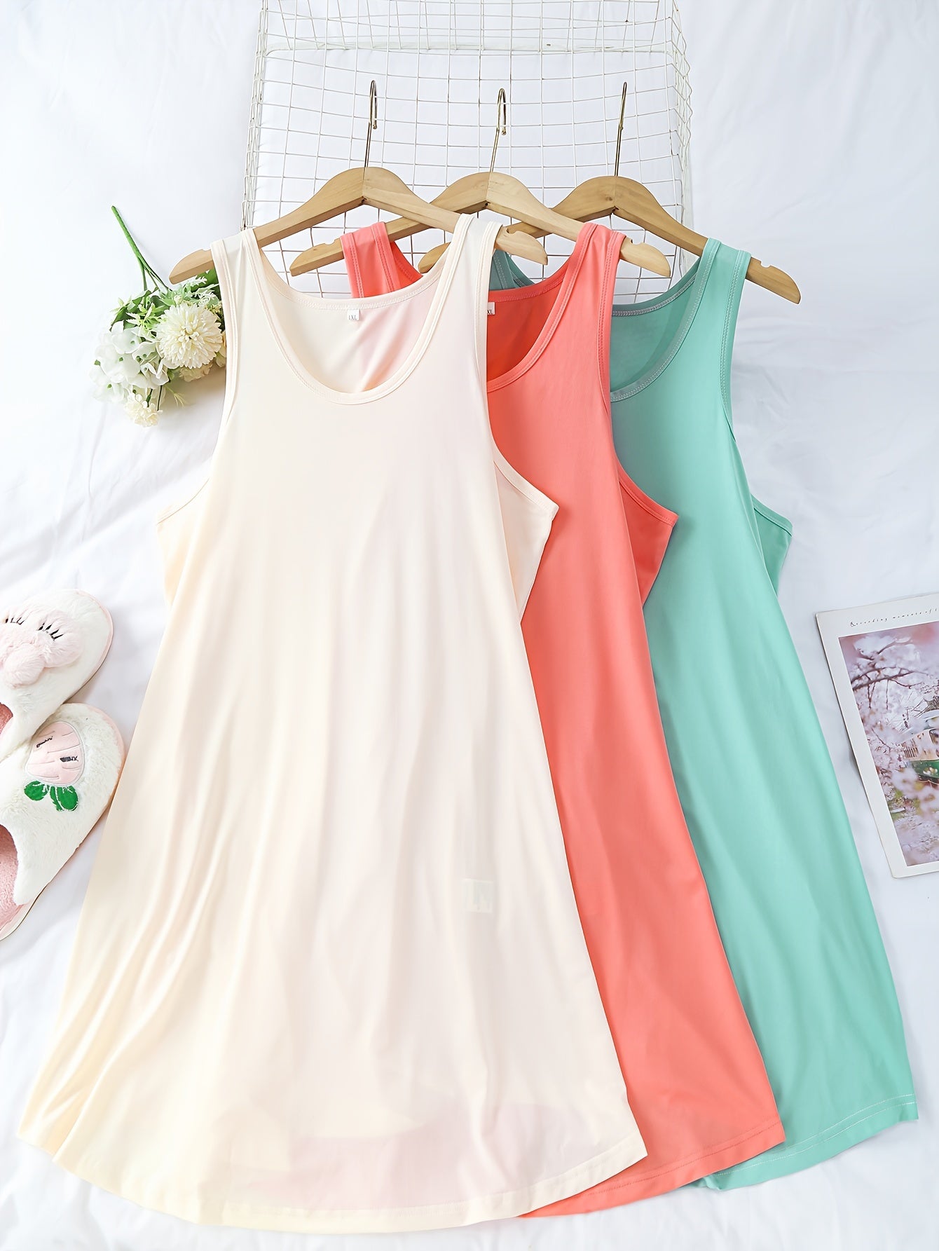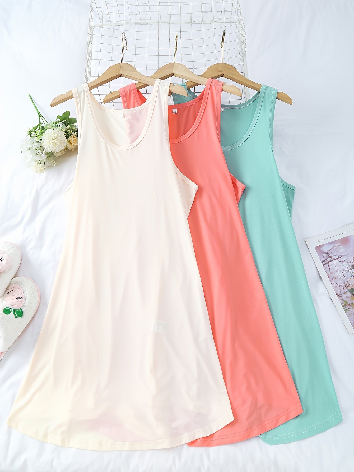 Mujeres camisón de noche de color sólido con cuello redondo, pack de 3, poliéster elastano