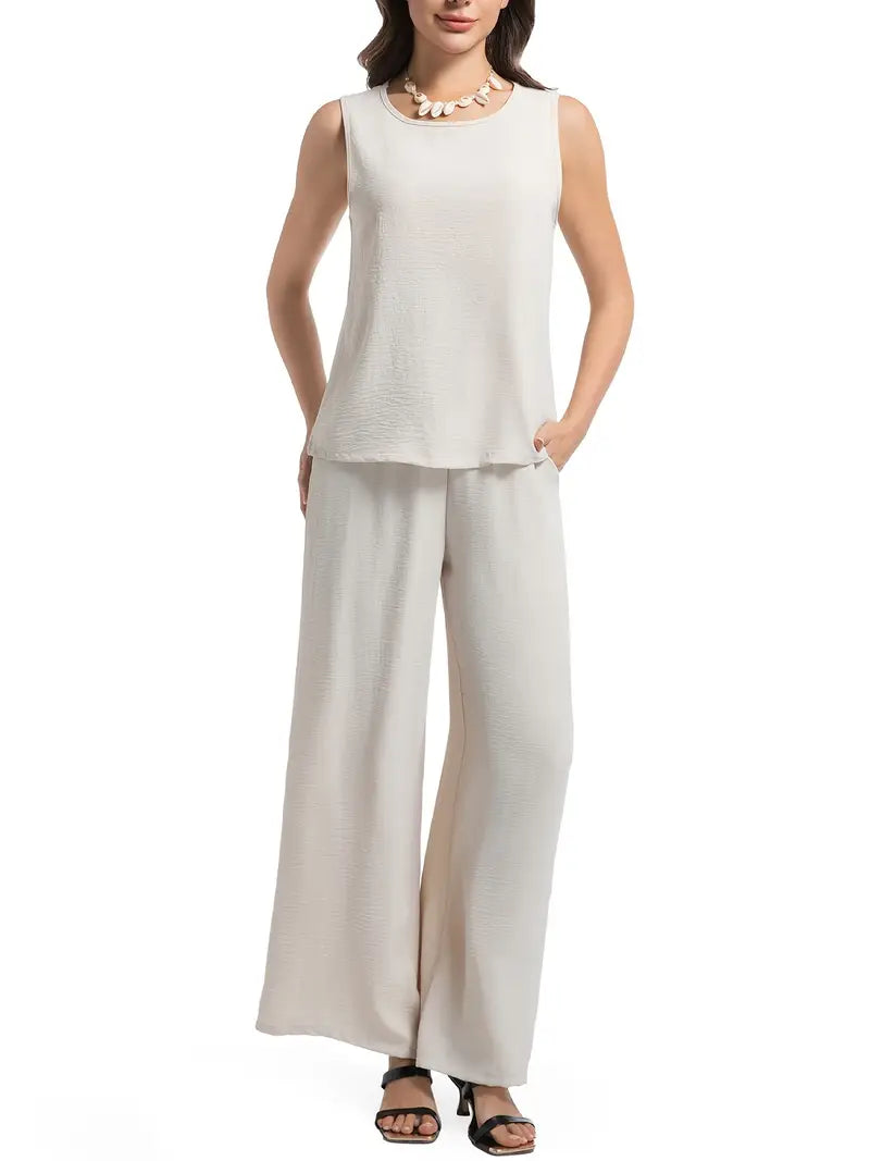 Conjunto de dos piezas de vacaciones bohemias para mujer en la playa, sin mangas, pantalones, casual, verano