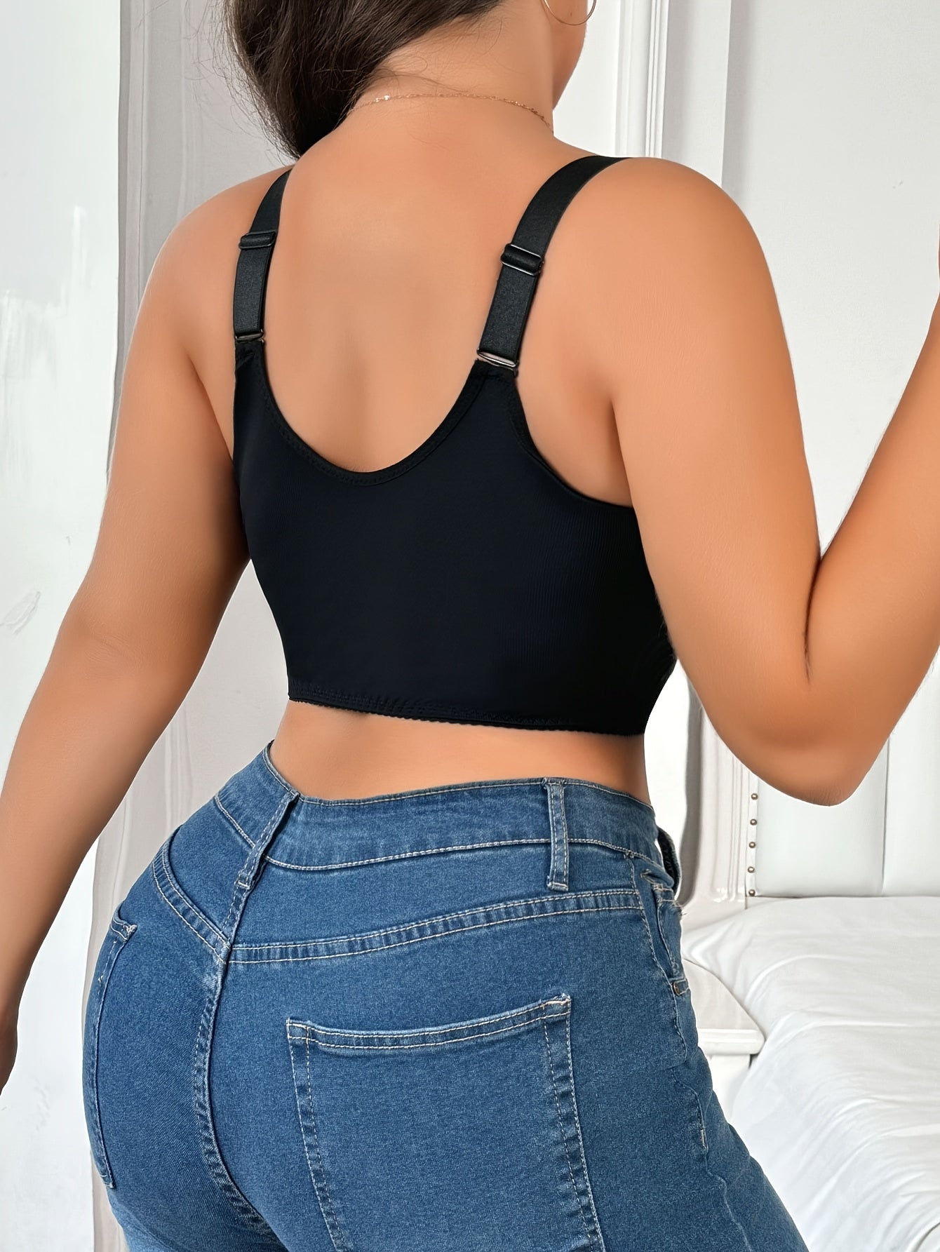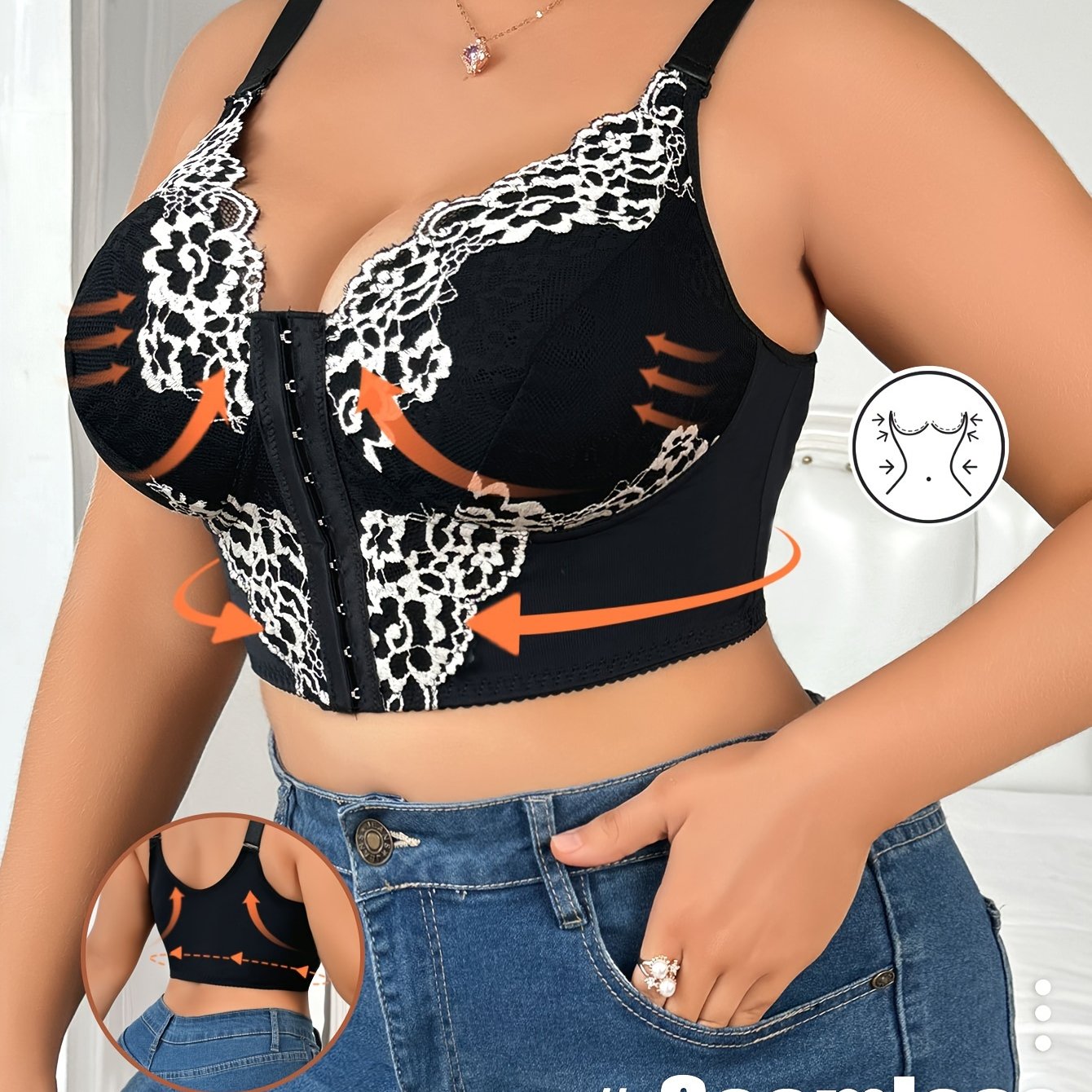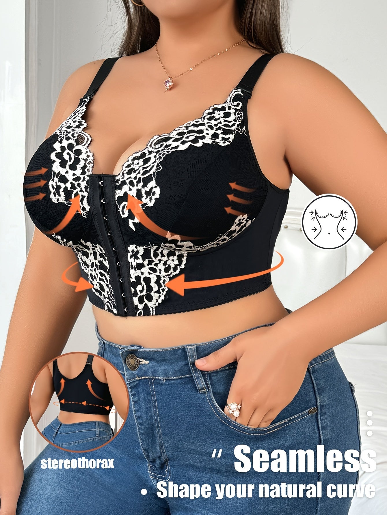 Sujetador de encaje de talla grande sin aros con cierre frontal floral de poliéster de estiramiento medio