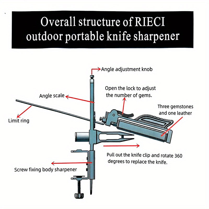 Afilador de cuchillos portátil para exteriores, ajustable de 15-30°, soporte de clip de 360°