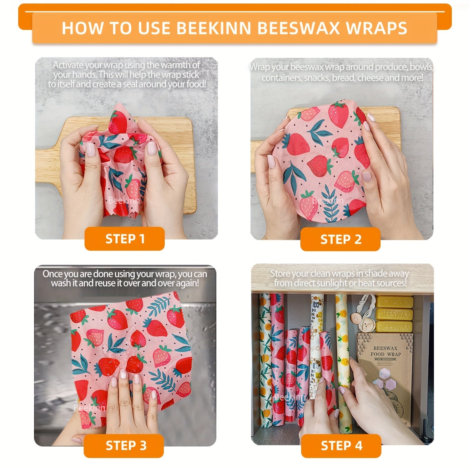 Juego de 5 envoltorios de cera de abeja ecológicos para alimentos, queso, fruta, pan, snacks