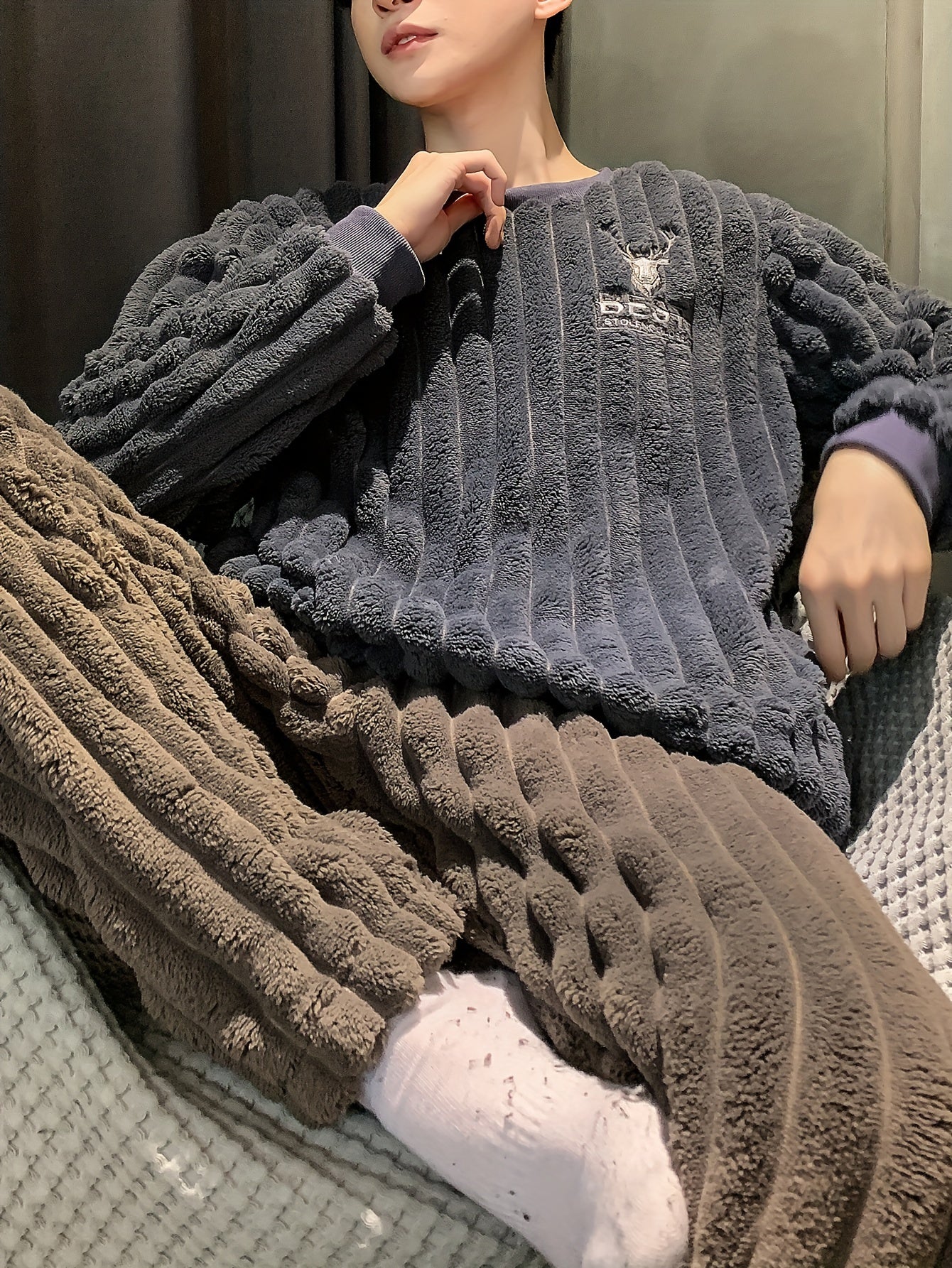 Conjunto de pijama de felpa para hombre con capucha, manga larga, color sólido, otoño e invierno, casual